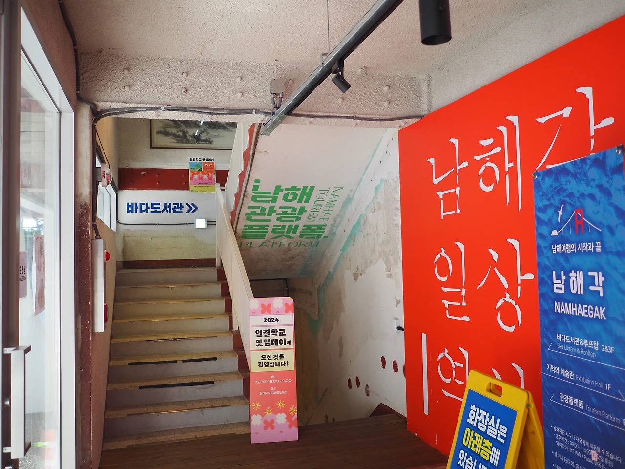 긴 하루가 아직 끝나지 않았다. 동기를 두모마을에 데려다주고, 잠시 쉬었다가 다시 건우 님을 태우고 남해각으로 향했다. 남해각은 남해대교가 남해군으로 들어오는 유일한 통로였던 시절, 휴게소와 여관을 겸한 공간이었다. 그 시절 남해로 신혼여행을 온 부부들이 많이 묵었던 공간이기도 하다. 남해각에 서면 남해대교의 빨간 기둥이 선명하게 보인다. 마침 날이 좋아 멀리까지 시원하게 보이는 풍경에 마음이 뚫리는 기분이다.