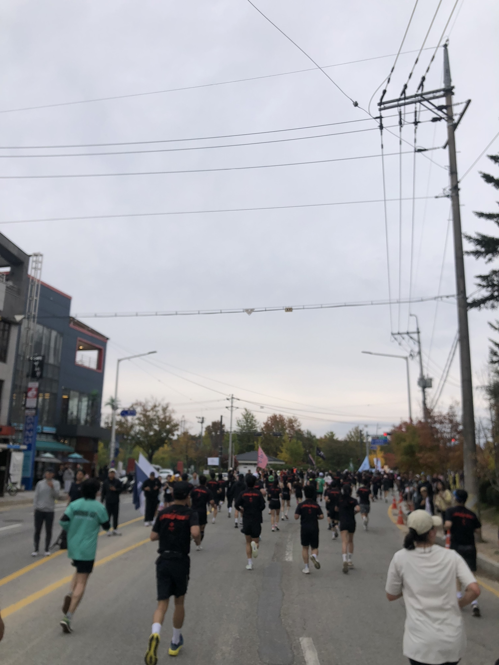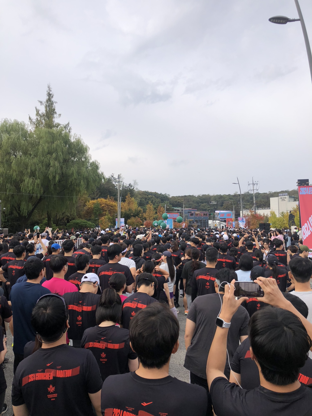 같이 셀카를 남기고 조금 더 뒤에 줄로 자리를 옮겼다. 페이스가 좋으면 줄 앞에 서는 게 좋지만, 줄 앞에서는 그만큼 기록을 남기기 위해 몸싸움이 벌어지기도 한대서 안전하게 뒷쪽에 서기로 한 것이다. 한산했던 우리 주변도 사람들로 꽉 찰 때 쯤, 줄이라고 부르기엔 이제 거대한 군중이 된 무리가 앞으로 이동하기 시작했다. 드디어 A조가 출발한 것이다. 출발선 앞으로 오니 저 멀리 작게 보이는 응원단이 음악에 맞춰 동작을 하는 게 보인다. 춤인지 준비운동인지 모를 율동을 어설프지만 흥겹게 따라했다.