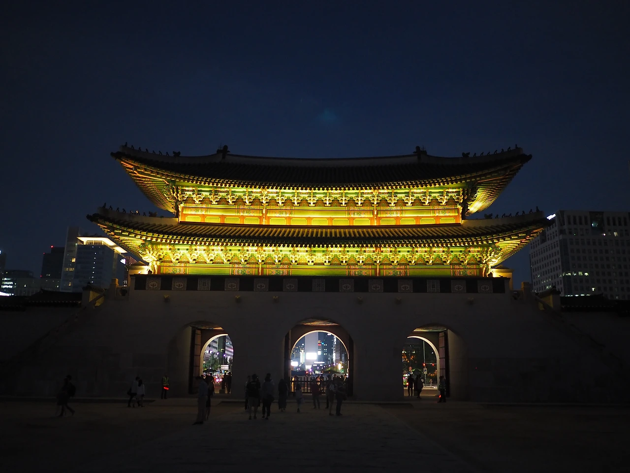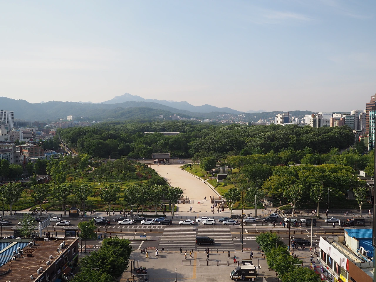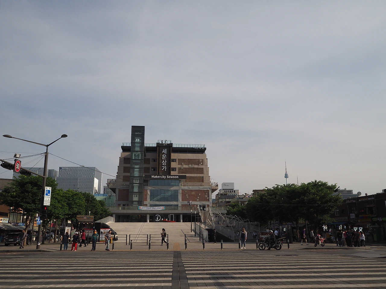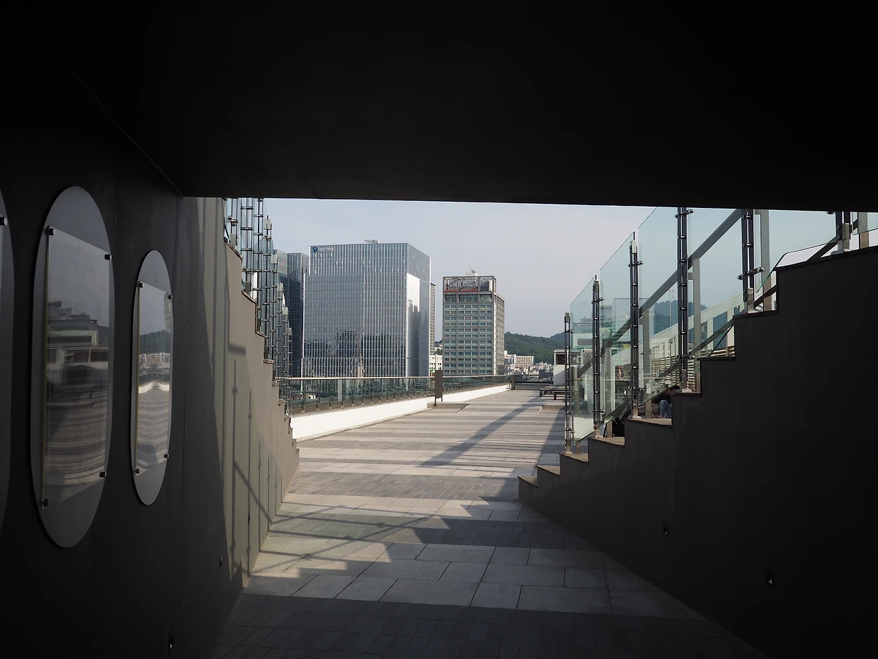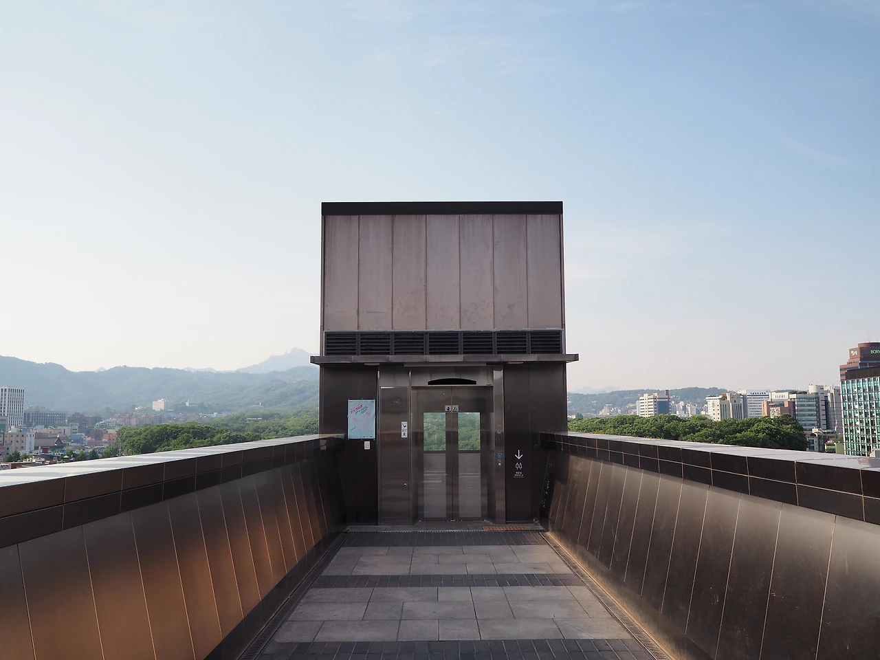 다시 흙길을 따라 걸어 제사를 준비하던 재궁을 구경한 후 밖으로 나왔다. 길 건너 오래된 세운상가 건물이 보였다. 새로 만든 듯한 투명한 유리 엘리베이터가 먼저 눈에 들어오고, 그 위에 있는 유리난간이 보였다. 호기심에 한번 올라가 보자 했다. 스킵플로어로 된 낡은 복도를 지나 엘리베이터에 올랐다. 느린 속도로 오르는 승강기에서 종묘의 입구 격인 외대문과 그 뒤의 숲이 유리벽 너머로 보인다.