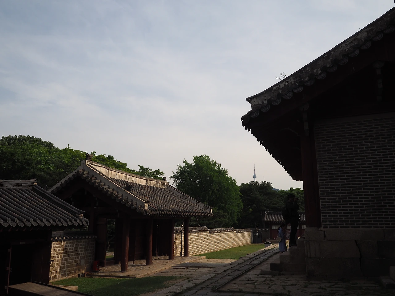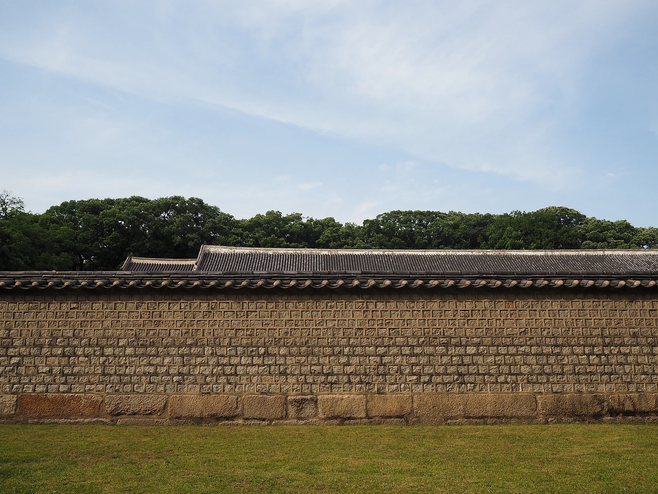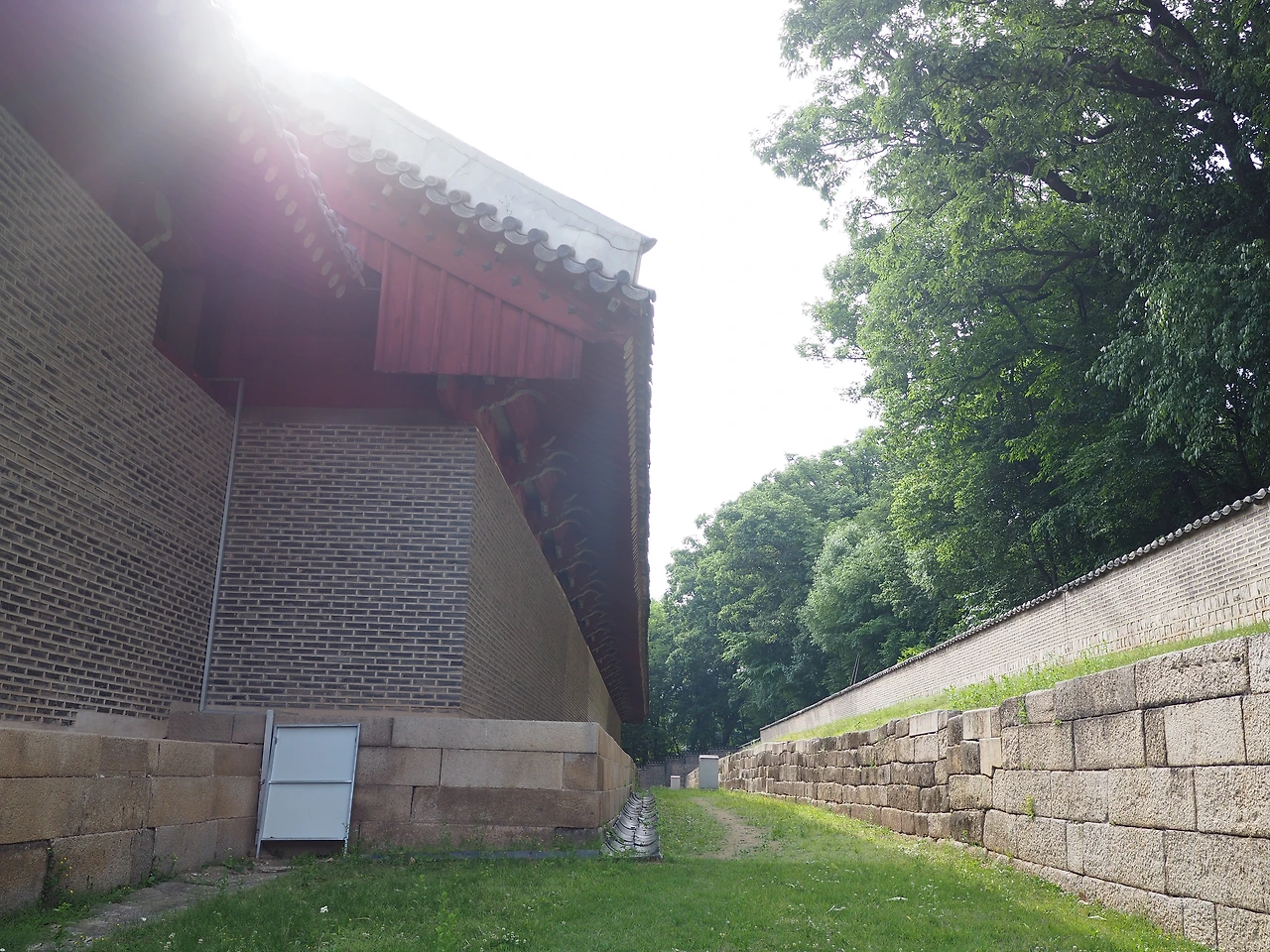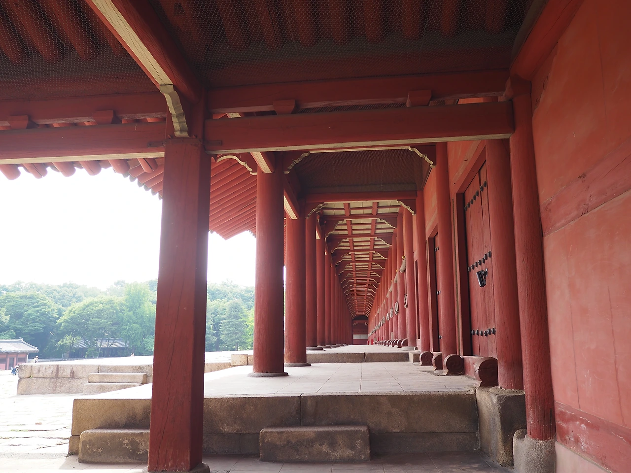 해가 비치는 흙길을 따라 걸어 남신문을 통해 정전으로 들어갔다. 궁이라면 화려한 단청이 가장 먼저 보일 텐데, 이 곳은 그 흔한 장식이나 색상 없이 담백하다. 왕실의 제사를 모시는 공간이기에, 존엄하고 신성한 분위기를 만들기 위한 의도적인 장치라고 한다. 기다랗게 이어진 열주 앞을 걸었다. 마침내 측면에 도착하니 기둥이 늘어선 공간이 한눈에 들어온다. 정전 뒤편에는 기와가 끝나는 선을 따라 바닥에 오목하게 기와가 한 줄로 깔려 있다. 빗물이 흙바닥을 패지 않게 하기 위함이다.