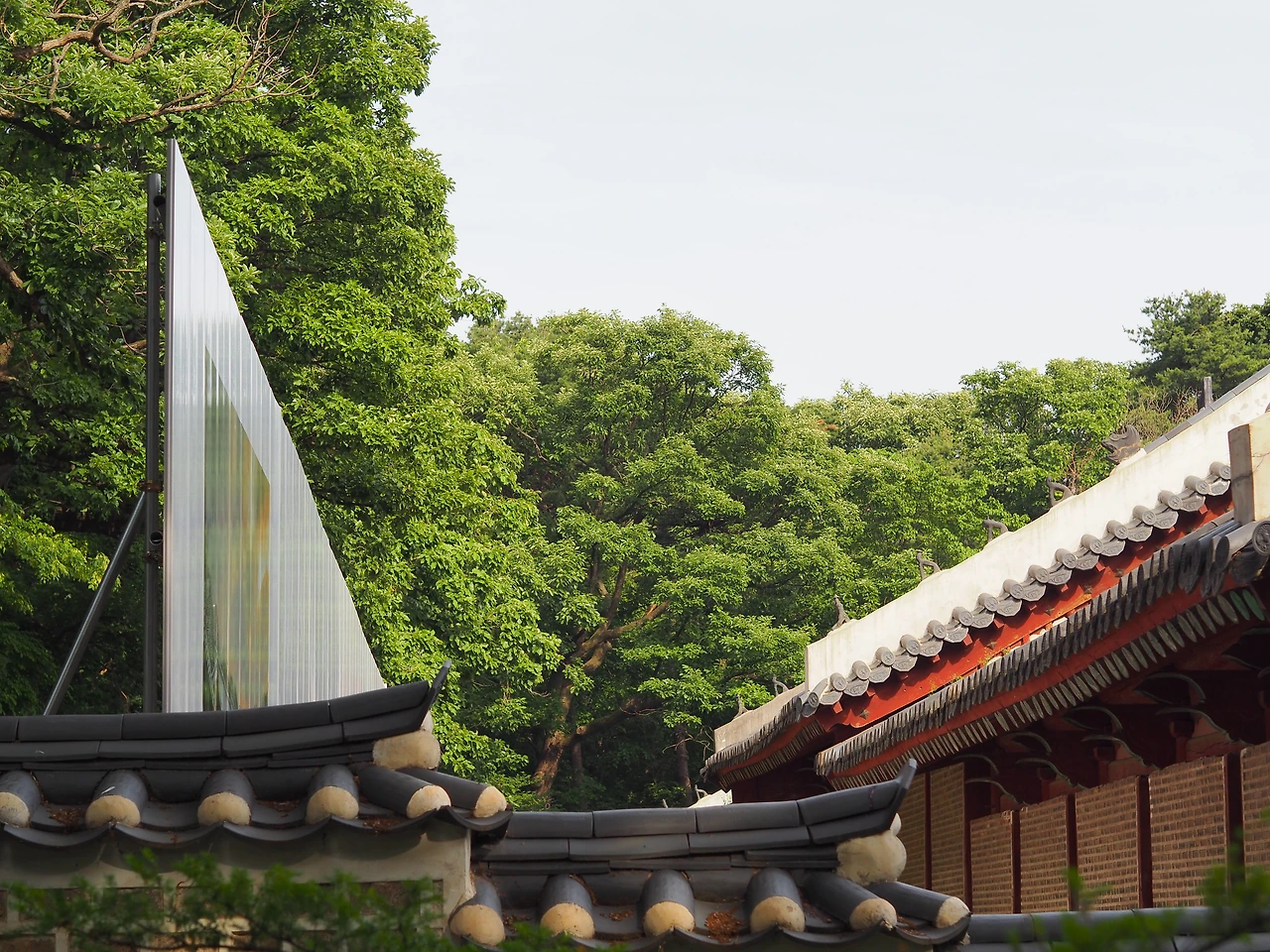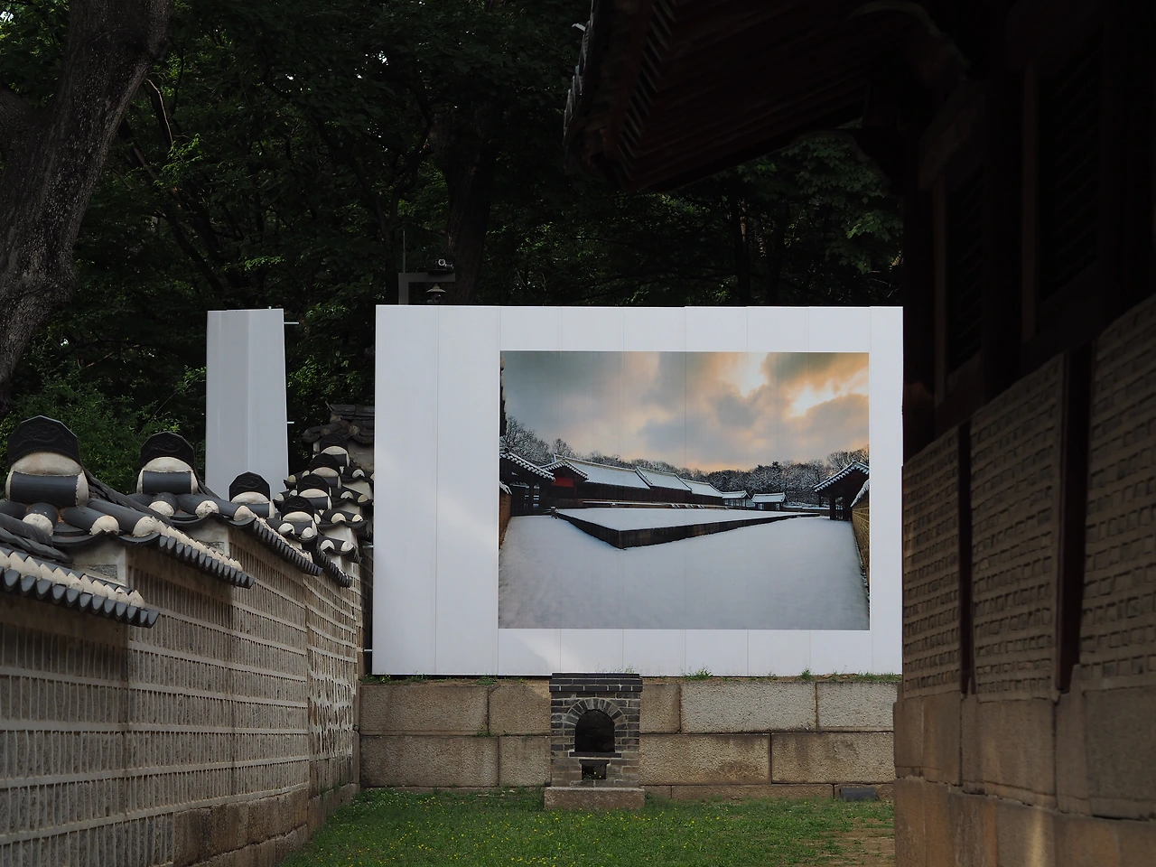 단아한 먹색 기와가 붉은색 기둥 위로 열 맞춰 올라가 있다. 한 바퀴 돌아보고 나가려는데, 측면에 있는 문에 다가가니 겨울의 종묘를 찍은 사진이 저 멀리 있다. 하필 사람도 들어가지 못하는 곳에 왜 저리 멋진 사진을 걸어두었나 했다. 밖에 나와서 보니 영녕전 뒤편을 공사하느라 가려둔 공사 가림막에 사진작가가 찍은 종묘의 사진을 프린팅한 것이다. 전시가 아니라 가리려는 목적이다 보니 멀리 있을 수밖에! 센스에 감탄했다.