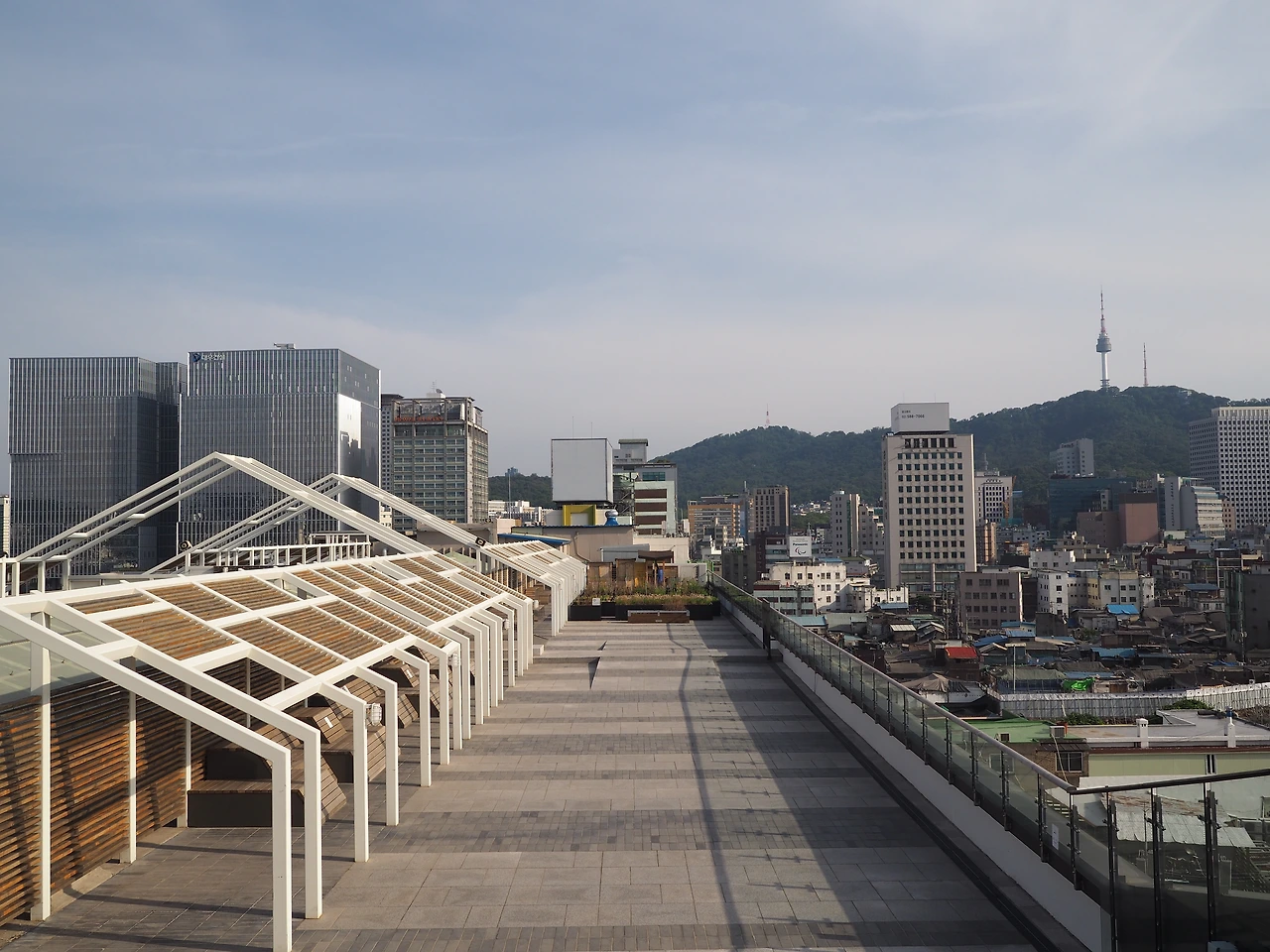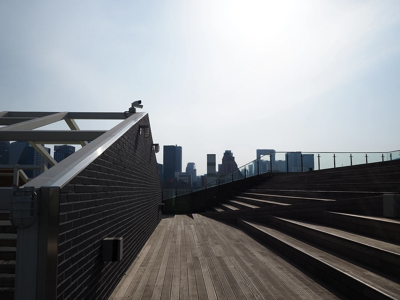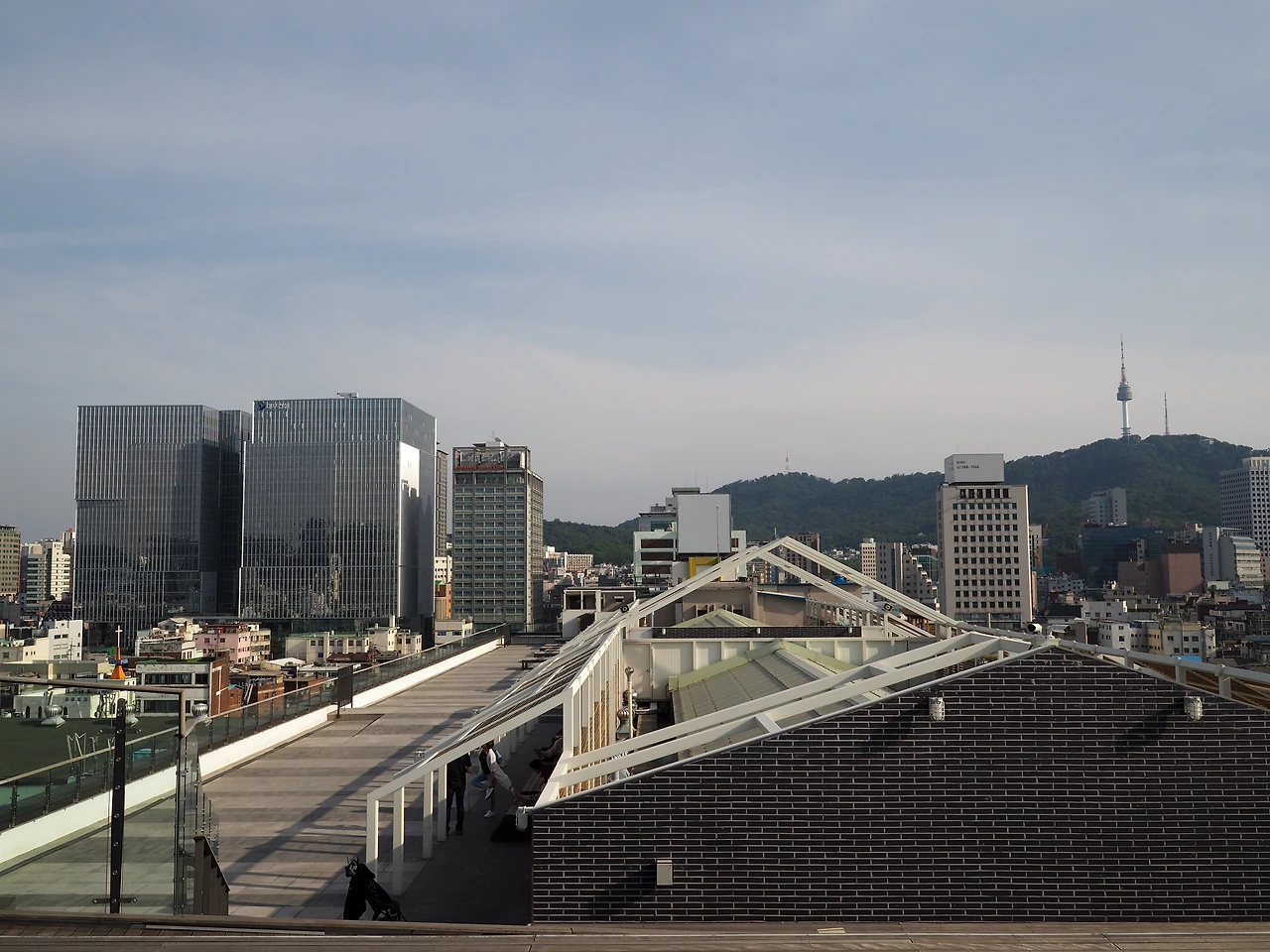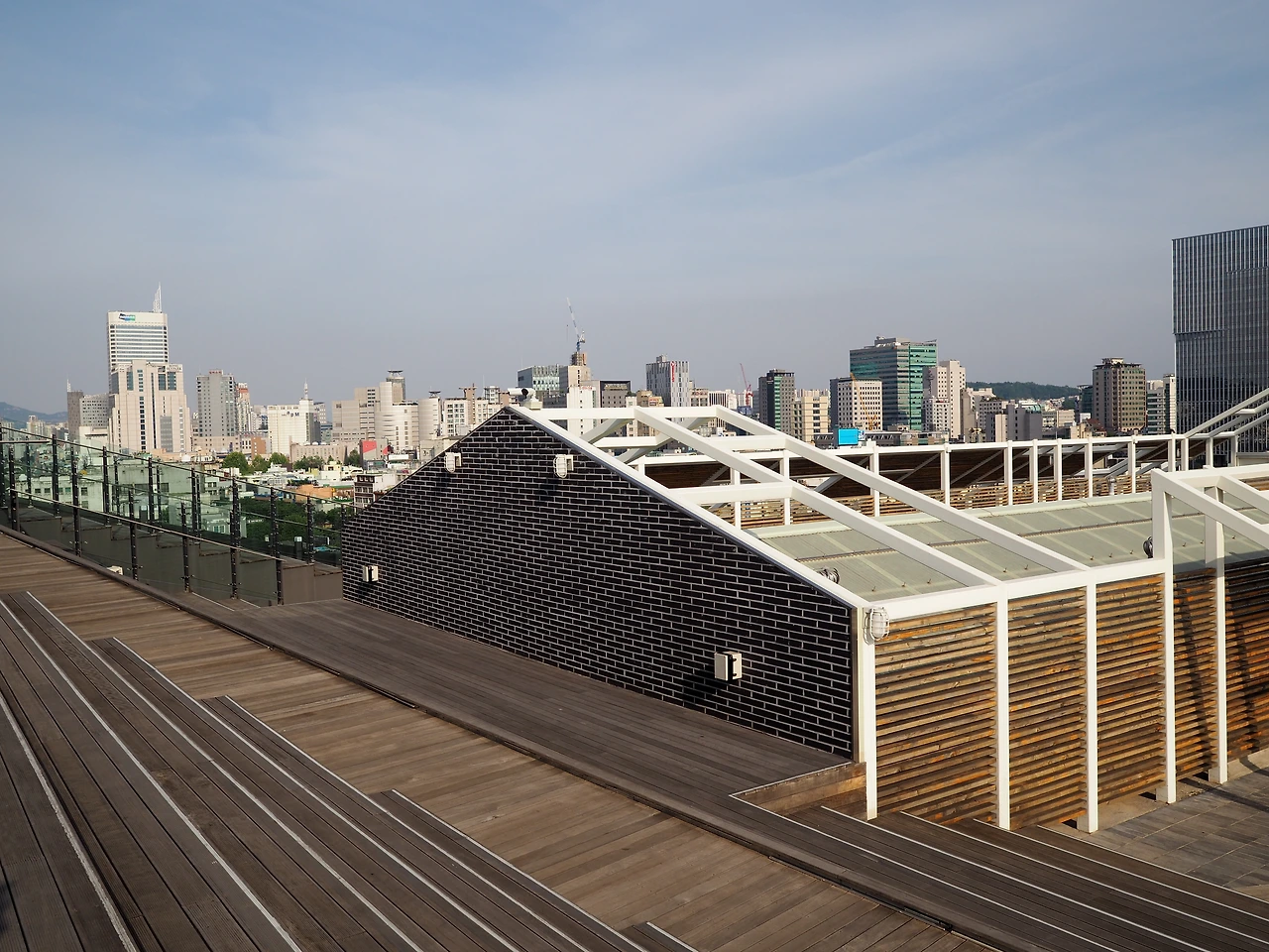다시 발길을 옮겨 옥상 데크로 올라갔다. 생각보다 옥상 공간이 꽤 넓다. 좌우로 차양과 벤치가 있어 시민들이 편히 기대듯 누워 오후의 햇살과 바람을 즐기고 있다. 나무 데크를 밟고 더 높이 올라갔다. 계단식 데크 사이로 경사로를 만들어 두었다. 배리어 프리(Barrier Free) 디자인이다. 계단 꼭대기에 종묘 앞에서 보았던 그 난간이 펼쳐져 있다. 특별한 것 없이 유리로 만든 난간인데, 보이는 풍경은 몹시 특별하다. 북쪽으로는 종묘가, 동쪽과 서쪽으로는 종로 거리와 재개발 구역이 보인다. 석양을 구경하기에 안성맞춤일 것이다. 아쉽게도 해가 지려면 시간이 많이 남아 해넘이 구경은 다음으로 미루었다. 잠시 벤치에 앉아 쉬니 바람이 알맞게 불어 땀을 식혀준다. 맥주 한 잔이 간절하다.