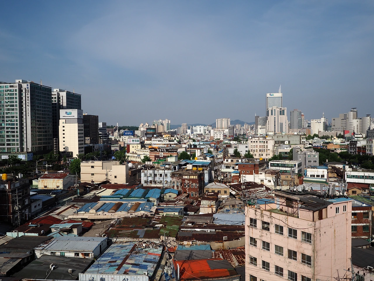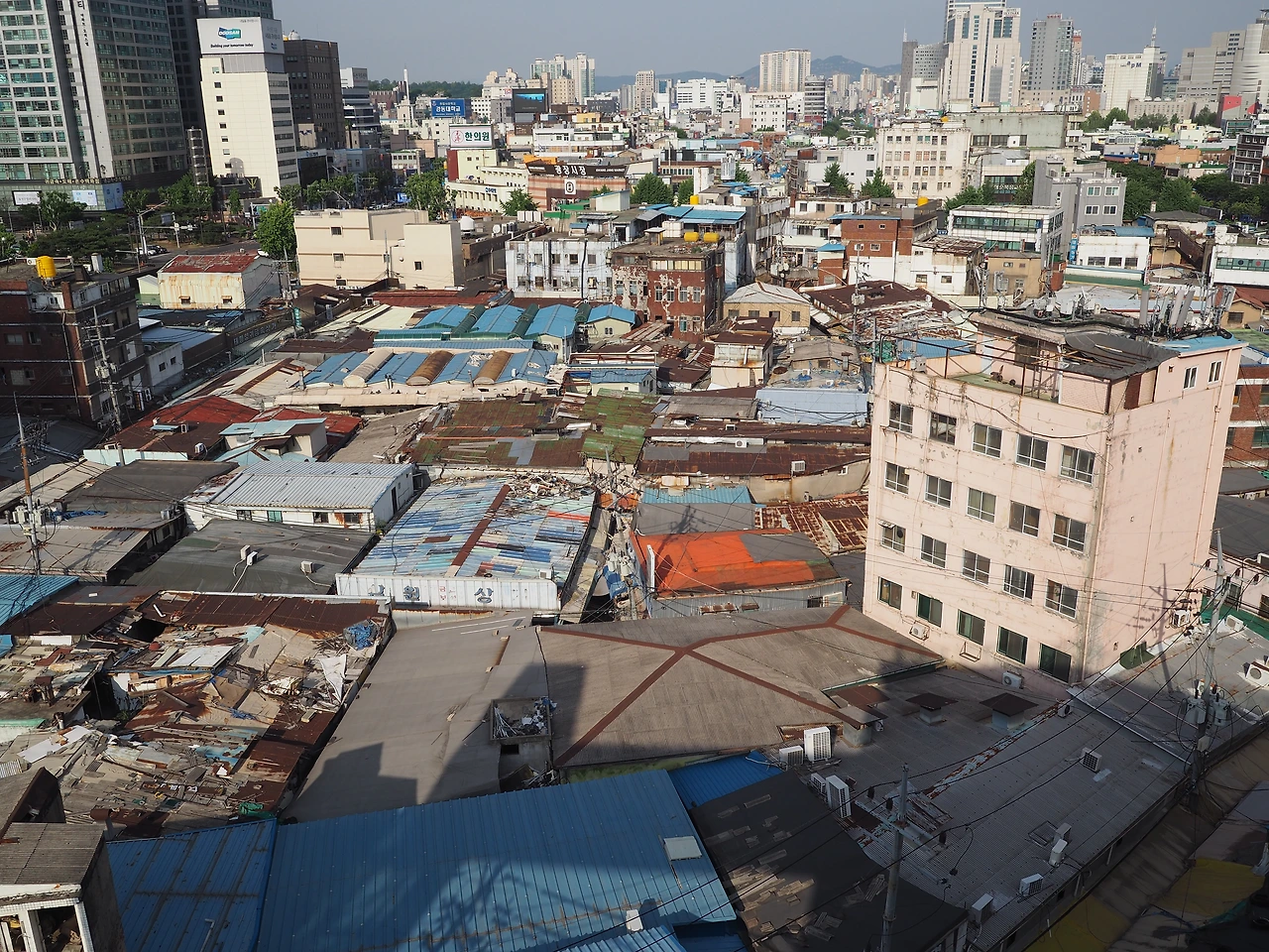 작품 패널 너머로 유리난간이 설치되어 있고 아래가 내려다 보인다. 주변의 화려한 고층 건물 사이로 세운상가 바로 옆 구역만 허름한 판잣집들이 얼기설기 놓여 있다. 마치 인도의 빈민가를 연상케 하는 풍경이다. 뉴스로는 접했지만, 실제로 보니 다소 충격적인 장면이다. 현대 서울에 이런 공간이 아직까지 있다는 것을, 서울 시민들은 알고 있을까. 옥상에 서있는 것만으로도 재개발의 당위를 설명해주는 공간이다.