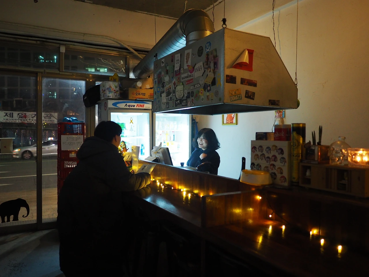 혼술하기 딱 좋은 8인용 바 테이블이 주된 공간이고, 안쪽에도 4인석 하나, 2인석 2개가 있는 아담한 가게이다. 안주는 예술가들의 주머니 사정을 고려하여 대부분 저렴하고, 부산 출신 윤 작가의 음식 솜씨가 좋아 양이 푸짐하고 맛있다. 종종 철마다 올라오는 특선메뉴가 또 별미다. 겨울에 스지오뎅탕이나 과메기를 주문하면 소주가 절로 땡기는 맛이다. 소고기를 잔뜩 넣어 오랜 시간 정성들여 만든 소고기 토마토스튜도 이 가게의 스테디셀러이다.