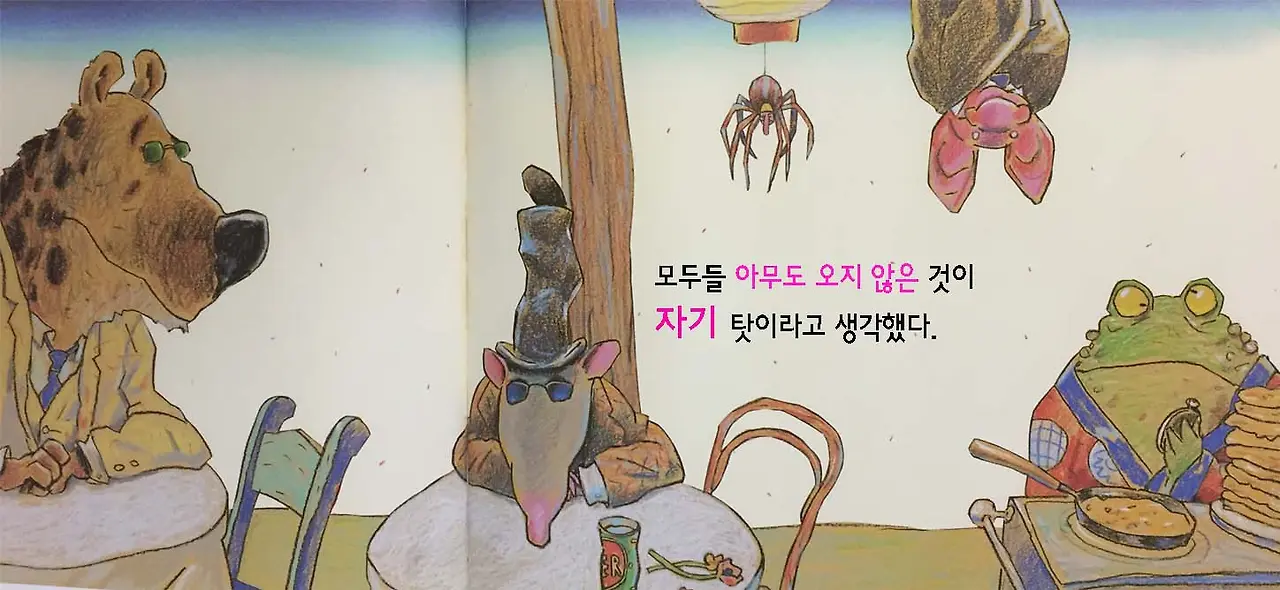 쥐는 하이에나가 무슨 말을 하는지 알아차렸다. 쥐는 살짝 미소를 지으며 외투 깊숙한 곳에서 조심조심 작은 기타를 꺼내 연주하기 시작했다.