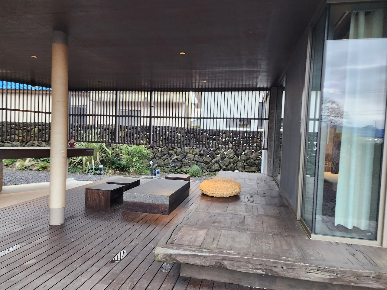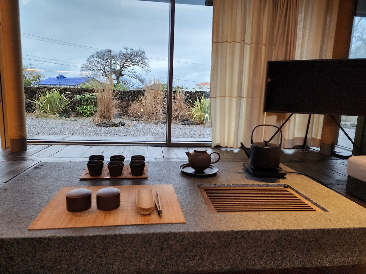 . 다탁 앞으로 펼쳐지는 풍경. 높지도 낮지도 않게 편안한 데다가 마당의 조경과 나무 사이의 지붕 풍경이 양명함보다는 약간의 그늘과 촉촉하고 무속적인 원초의 감성... 맞습니다.