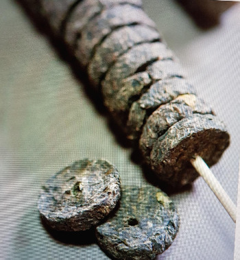 발효과정에서 파란색 이끼가 낀 것처럼 변한다 하여 '청태전'이라 하며