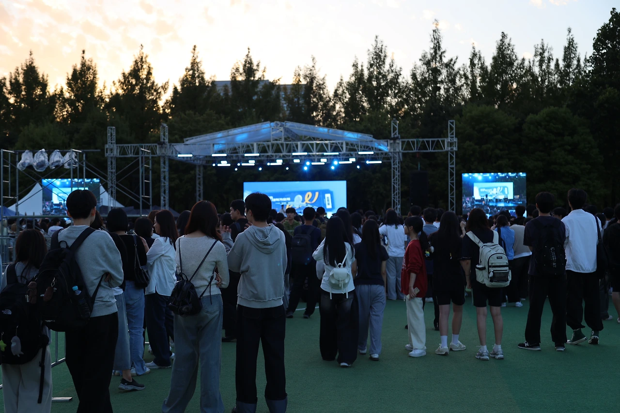 해가 지고, 운동장에 설치된 무대 앞에 모여드는 사람들. 설렘이 짙어지는 순간.