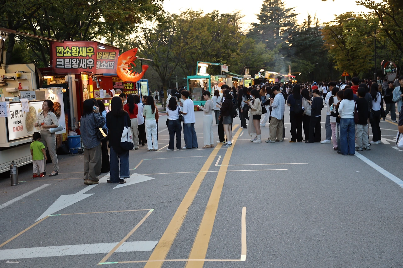 인기 푸드트럭 앞, 1시간 넘게 기다리더라도 즐겁게 웃는 사람들. 기다림조차 축제의 일부가 된다.