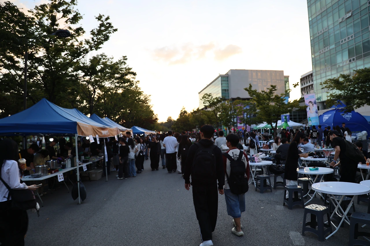 저녁 무렵, 전남대 후문 앞 도로를 가득 메운 먹거리 부스와 사람들. 테이블마다 웃음소리가 넘쳐난다.