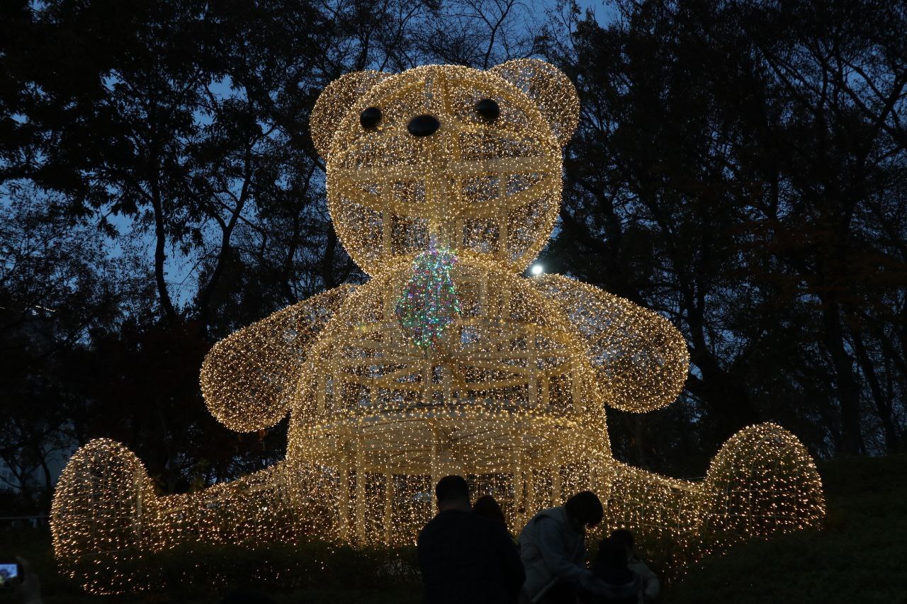 "남산공원에 설치된 대형 곰 조형물이 밤하늘 아래 빛을 밝혀 관람객들의 포토존으로 큰 인기를 모았다."