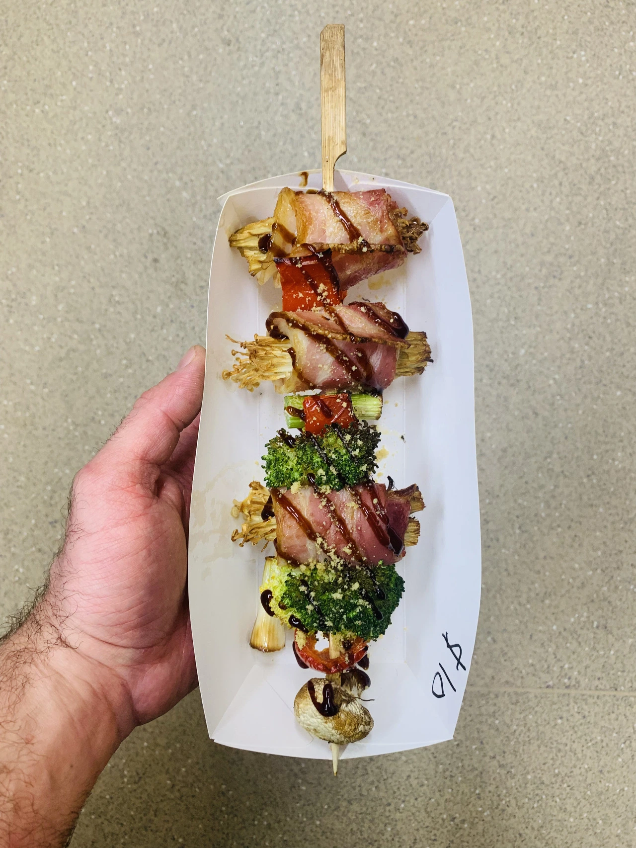 생각보다 길이가 긴 꼬치는 22cm 정도였고, 베이컨만 넣기에는 길이가 긴 느낌이 있어, 우리는 중간에 브로콜리를 사이에 넣기로 했다. 색깔 대비도 핑크색과 초록색이라 더 시선을 사로잡는 것 같고 말이다. 베이컨을 팽이버섯에 말은 것을 3개 정도 그리고 꼬치마다 조금씩은 다르게, 어떤 것은 버섯 그리고 브로콜리, 피망을 사이에 넣었다. 오븐에 190도 기준으로 넣고 15분~20분 정도 구웠다. 잘 구워진 것을 확인 후, 우리는 이에 데리야끼 소스를 뿌려주고 이쁘게 파마산 가루 베이스로 만든 마법의 믹스 가루를 솔솔 뿌렸다.