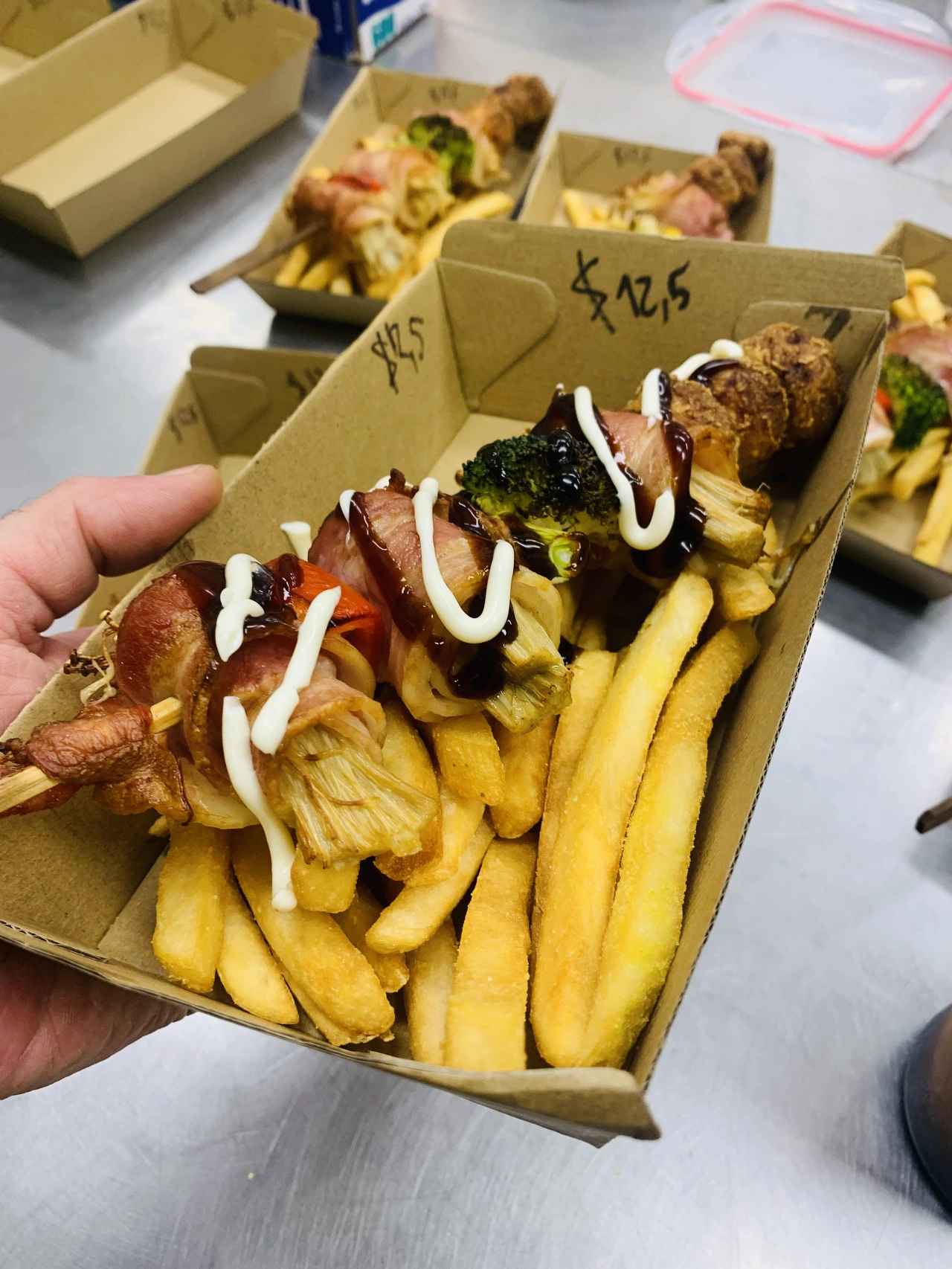 야심 차게 만든 베이컨 버섯말이 꼬치가 1시간이 지나도 팔리지 않는다. 이에 우리는 그들이 다음으로 좋아하는 감자튀김을 함께 넣어 팔기로 결정했다. 감자튀김을 조금 넣어 진열대에 넣어봤는데도, 다른 음식들은 팔리는데 이것만이 남겨졌다.