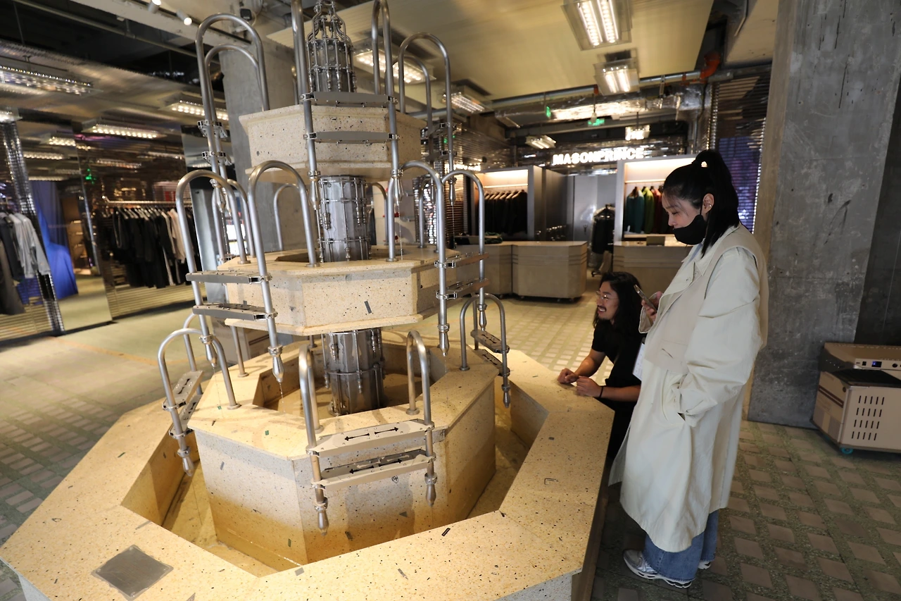 MASONPRINCE의 재해석: 이들은 이 기묘하고 불안한 감성을 '새롭고 탐험하고 싶은' 매력적인 경험으로 재창조했습니다. 1층은 타일로 마감된 '욕실'과 '수영장 분수'가 결합된 기묘한 공간으로, 2층은 복고풍과 미래가 혼합된 '초현실적 사무실'로 꾸며졌습니다. 익숙하면서도 낯선 이 공간은 방문객에게 마치 '다른 차원의 세계를 탐험'하는 듯한 강렬한 몰입감을 선사합니다.