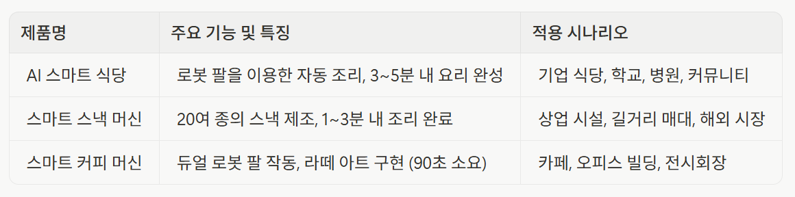 희향과기의 주요 제품은 스마트 식당, 스마트 스낵 머신, 스마트 국수 기계, 스마트 커피 머신 등으로 구성됩니다 . 특히 'AI 식당' 솔루션은 식재료 준비부터 조리, 배식까지 전 과정의 정보화, 지능화, 표준화를 구현했습니다 .