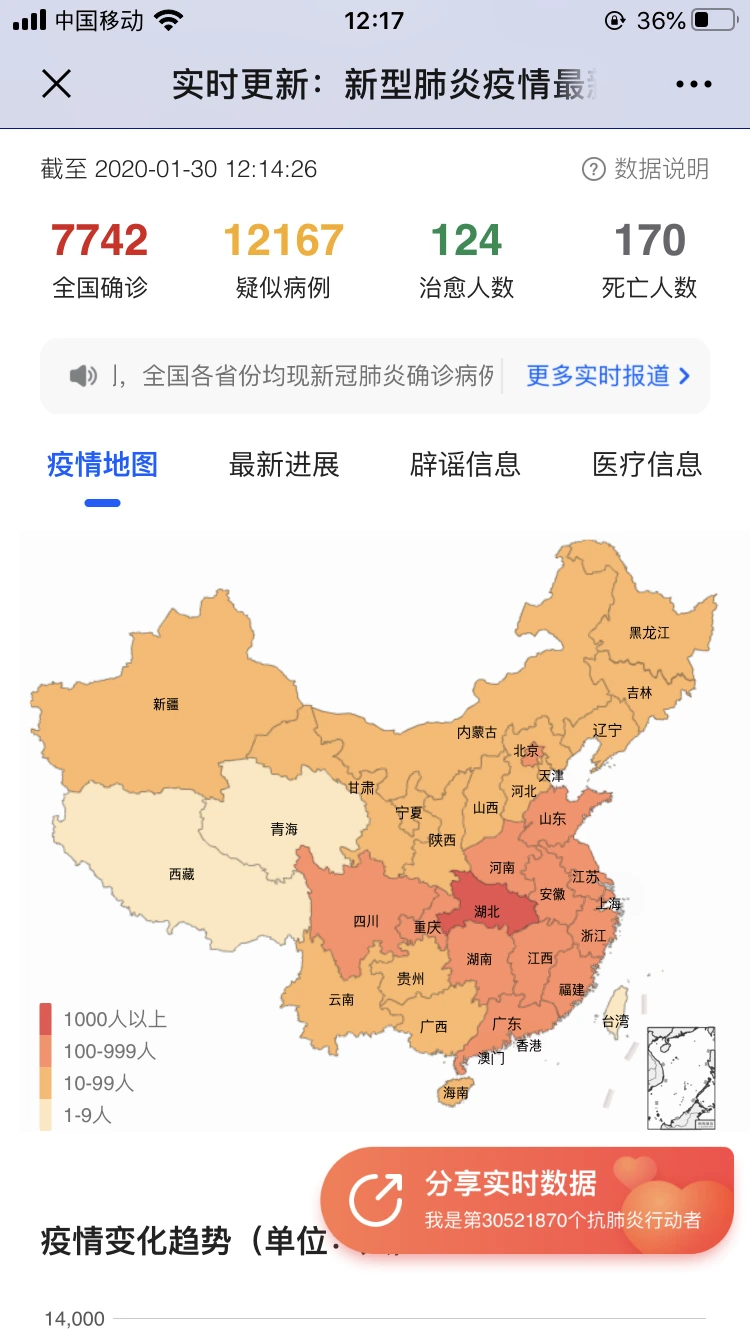 텐센트 또한 신종 코로나 발병 이후 전이 상황에 대해 알 수 있는 신규 플랫폼을 만들었습니다. 우한 폐렴 전문 페이지에 있는 확산 지도는 환자의 숫자를 볼 수 있을 뿐 아니라 중국 내 모든 지역 및 해외의 감염 진행 상태까지 자세히 제공되고 있습니다.