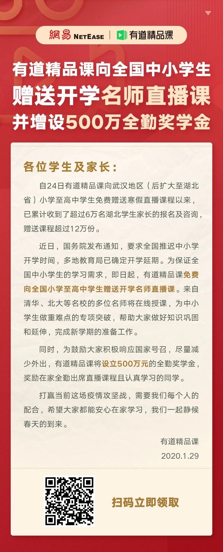 직장인뿐 아니라 초중고등학교 등의 학생들 또한 일상이 멈추었습니다. 중국 전역의 학생들의 학업에도 큰 지장을 줄 수 있는 상황에 한 유명 인강 업체가 이를 지원하고 있습니다. 베이징대 , 칭화대 등 명문대 출신의 인기 강사의 라이브 강의를 전국 초중고생에게 무료로 제공하고 있으며 이와 함께 학생들의 외출 자제를 독려하기 위해 500만 원의 출석 장학금 이벤트 또한 자체적으로 진행하고 있습니다. 학생들은 자신의 학년과 커리큘럼을 선택한 후 인강 시청이 가능하며 등록 후 전해진 시간에 출석과 학습이 가능합니다.