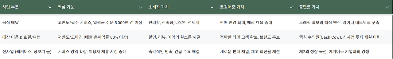 이익기여도: 매장/호텔 사업이 대부분의 이익을 창출하며, 음식 배달은 손익분기점 수준을 유지하고 있습니다. 신사업은 경쟁 심화에 따른 '방어적투자'로 인해 단기적인 손실을 기록하고 있으나, 미래 성장을 위한 필수적인 투자로 간주됩니다.