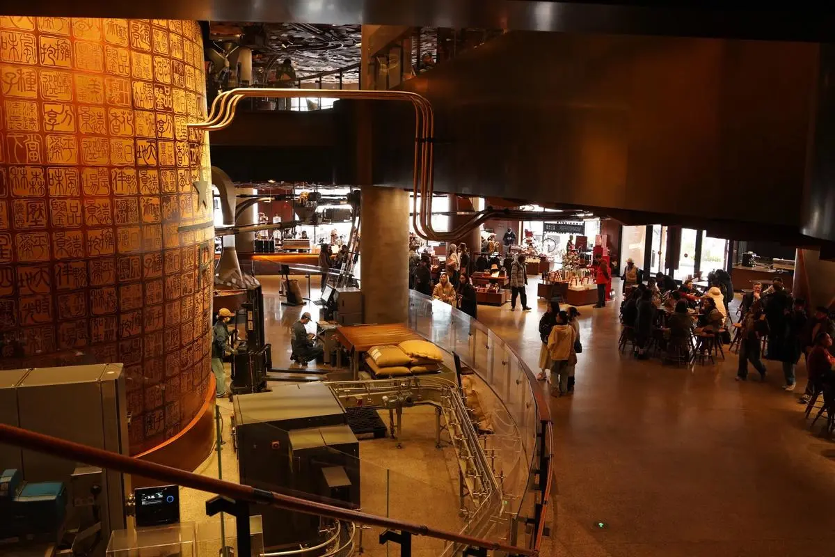 매장에 들어서는 순간, 우리는 2층 높이의 거대한 구리 로스팅 탱크를 마주하게 됩니다. 이것은 단순한 기계가 아닙니다. 표면에는 스타벅스의 역사를 담은 1,000개 이상의 중국 전통 인장(印章) 문양이 수작업으로 새겨져 있습니다. 이는 스타벅스의 글로벌 서사와 중국의 문화적 코드를 융합한 이 공간의 '심장'입니다.