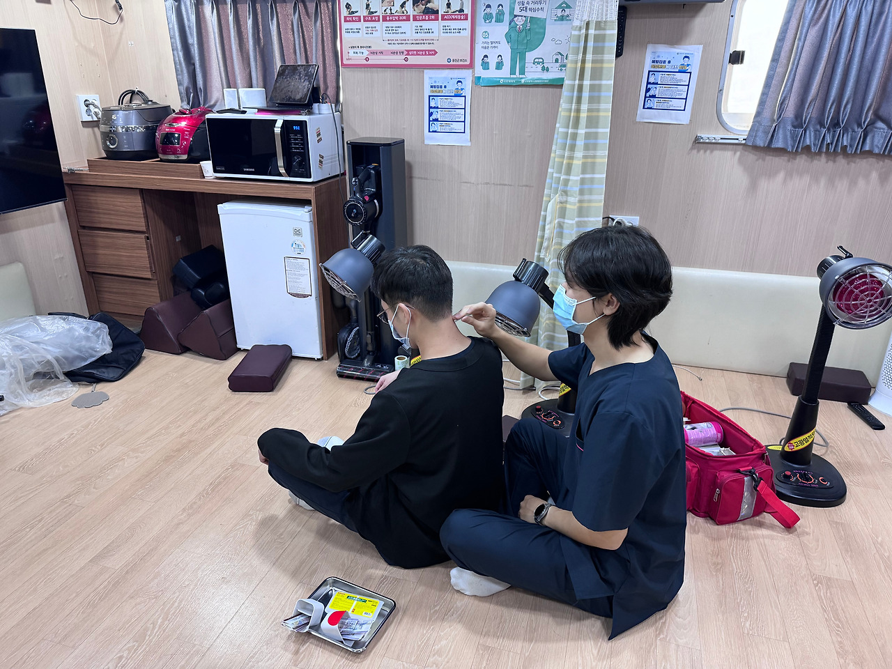 병원선의 모든 치료는 섬 주민분들 대상으로 무료로 시행되고 있습니다. 그래서 많은 분들이 오세요. 섬에 진료소가 없는 경우에는 환자분들이 배에 올라타서 치료 받게 되고, 섬에 진료를 볼 수 있는 진료소나 마을 회관 등이 있으면 저희가 그곳을 방문해서 진료를 보고 있습니다. 그래서 진료소 내에서 침 치료를 할 수 있게 항상 침 가방을 들고 다녀야 합니다. 만약 거동이 불편한 환자분이 치료받고자 하시면 저희가 직접 집에 방문해서 치료해 드리기도 하고요.