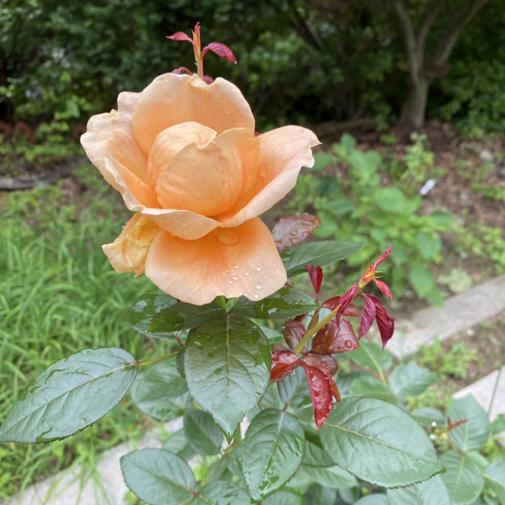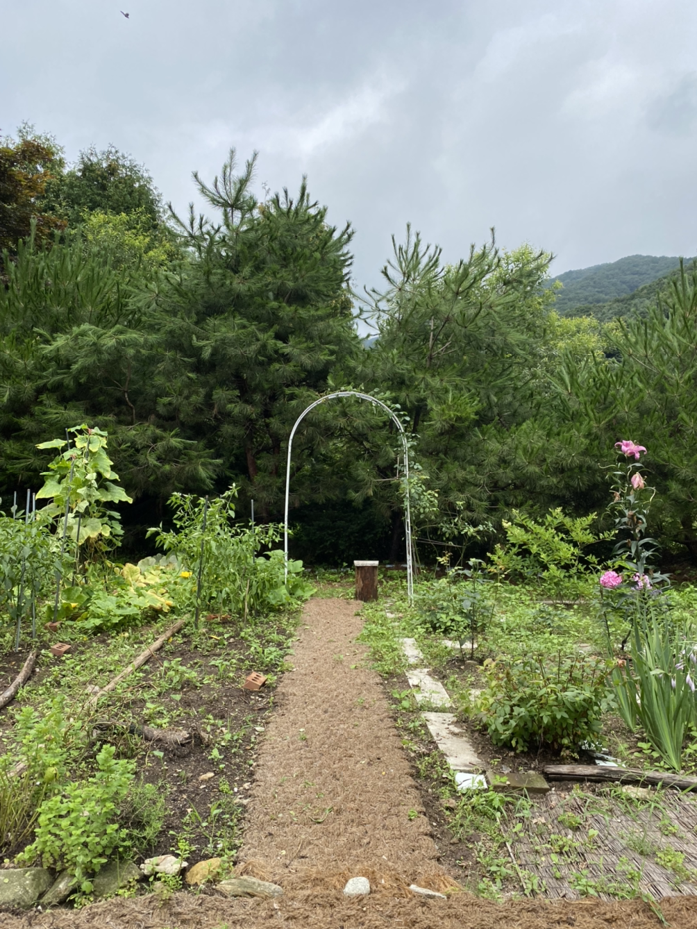 정원 뒷 줄에 혼자 줄을 늘여 트리고 있는 덩굴장미를 지지해줄 가든 아치를 설치했습니다. 우리 정원의 첫 시설물이에요. 키가 많이 큰 소나무들과 높은 하늘을 떠받치듯 동그란 윗 테가 참 예쁩니다.