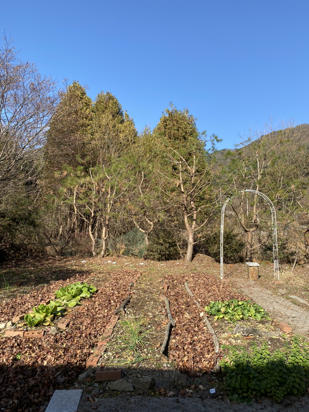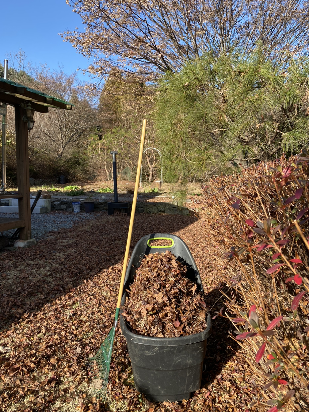 가을을 흠뻑 느끼고 싶기도 했고 내 게으름의 결과이기도 한, 마당 가득 쌓여있는 낙엽을 쓸어 담으려 합니다. 빨간 카펫처럼 고왔던 빛이 어느새 흙빛을 닮아가고 또 많이 말라있습니다. 이 아이들을 쓸어 담는 일은 사실 일도 아니에요. 바삭 거리는 예쁜 소리를 들으며 마당을 쓰담 쓰담하다 보면 가볍고 푹신한 낙엽 이불 몇 십 채가 만들어집니다. 낙엽 이불을 텃밭으로 옮겨 고랑 사이 길에 두둑이 깔아주었습니다. 올해 봄에 이렇게 텃밭 길에 낙엽을 깔아주었더니 잡초가 덜 자라는 것 같기도 하고 눈에 잘 띄지 않는 효과가 있더라고요. 낙엽이 삭으면 작물에게 유용한 거름이 되기도 하니 이점이 많습니다. 다만, 바람이 거세게 불면 이리저리 나뒹굴어 매번 모아주고 다독거려줘야 하는 수고로움이 동반되기는 합니다.