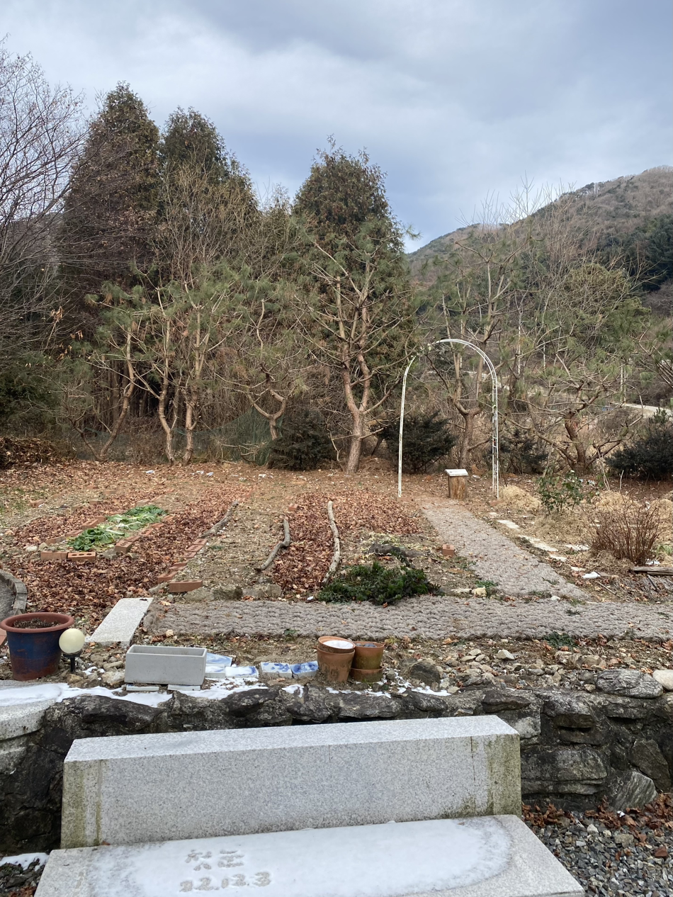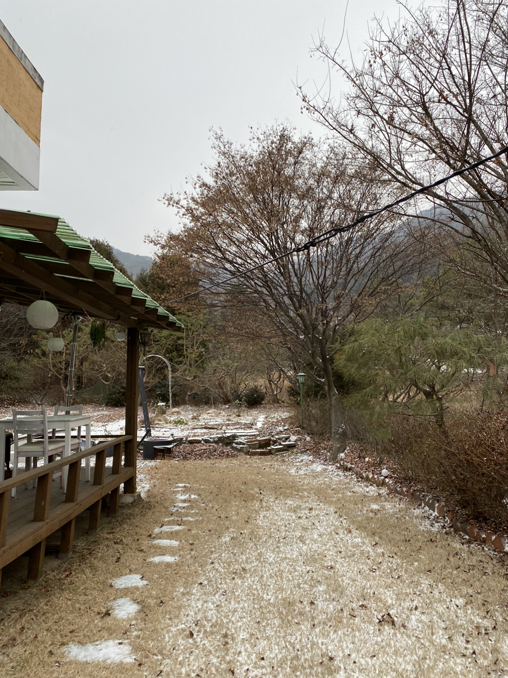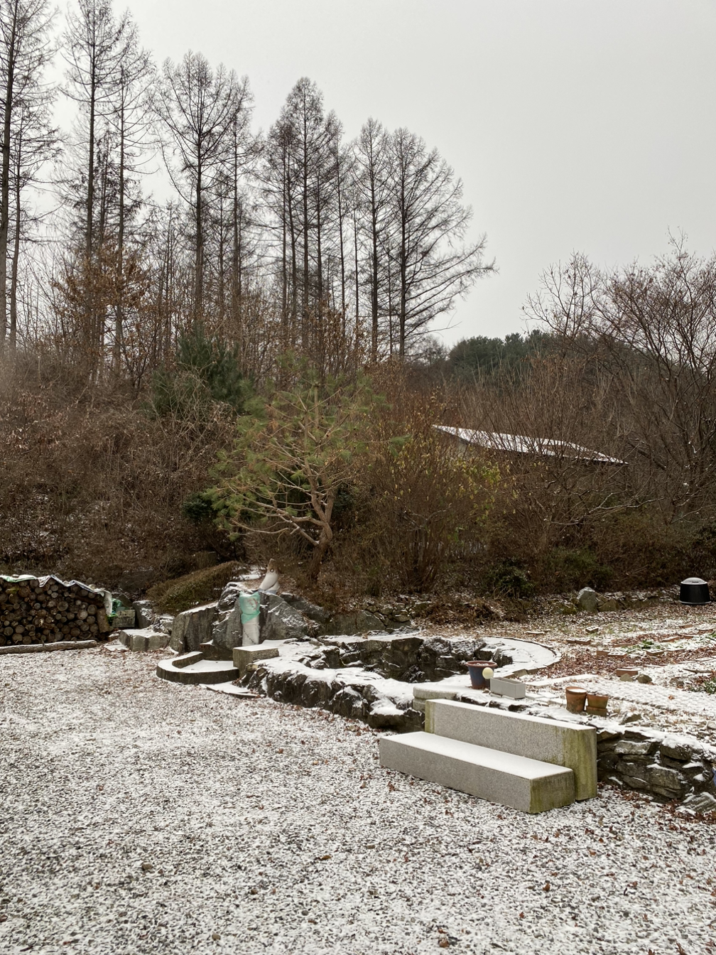 12월 3일, 시골집에 첫눈이 내렸습니다. 아침에 살포시 내려 마당에 조금 덮이는 듯하더니, 몇 시간 안에 자취를 감춘 수줍은 첫눈입니다. 정자 지붕에, 잔디 마당에, 텃밭으로 이사 간 낙엽 위에 옅게 칠한 하얀 물감처럼 덧대진 눈이 참 예쁘고 따뜻합니다.