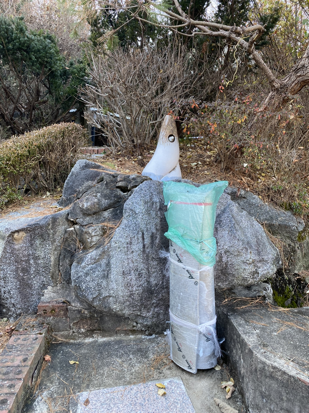 수도를 감싸는 스티로폼 기둥, 이것도 전 주인분이 쓰시던 것을 그대로 물려받았습니다. 폐품 활용 차원의 물건이지만, 우리 마당 수도 둘레에 딱 맞는 너비의 스티로폼 기둥과 그 위에 올려놓는 돌덩이까지 딱 맞춤이에요.