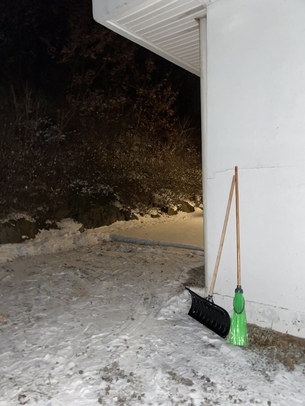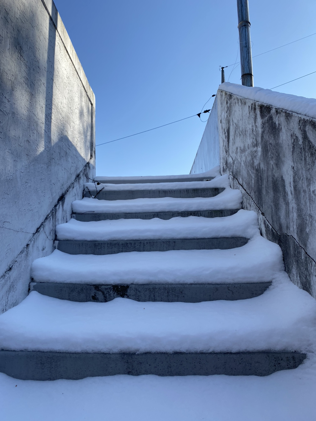 이 놀랍고 아름다운 경치를 즐길 겨를도 없이, 재빠르게 제설작업에 들어갑니다. 그래야 집 앞 후룹라이드 경사의 개울을 건너 집 마당에 들어갈 수 있어요. 때 마침 읍내 철물점에 들러 넉가래와 빗자루를 사 온 덕분에 수월하게 쌓인 눈을 대충 옆으로 치우고, 길가에 배치된 꽁꽁 언 모래주머니를 땅에 탕탕 내리쳐 부슨 후 가슴에 앉은 채로 경사가 심한 쪽부터 모래를 뿌립니다.