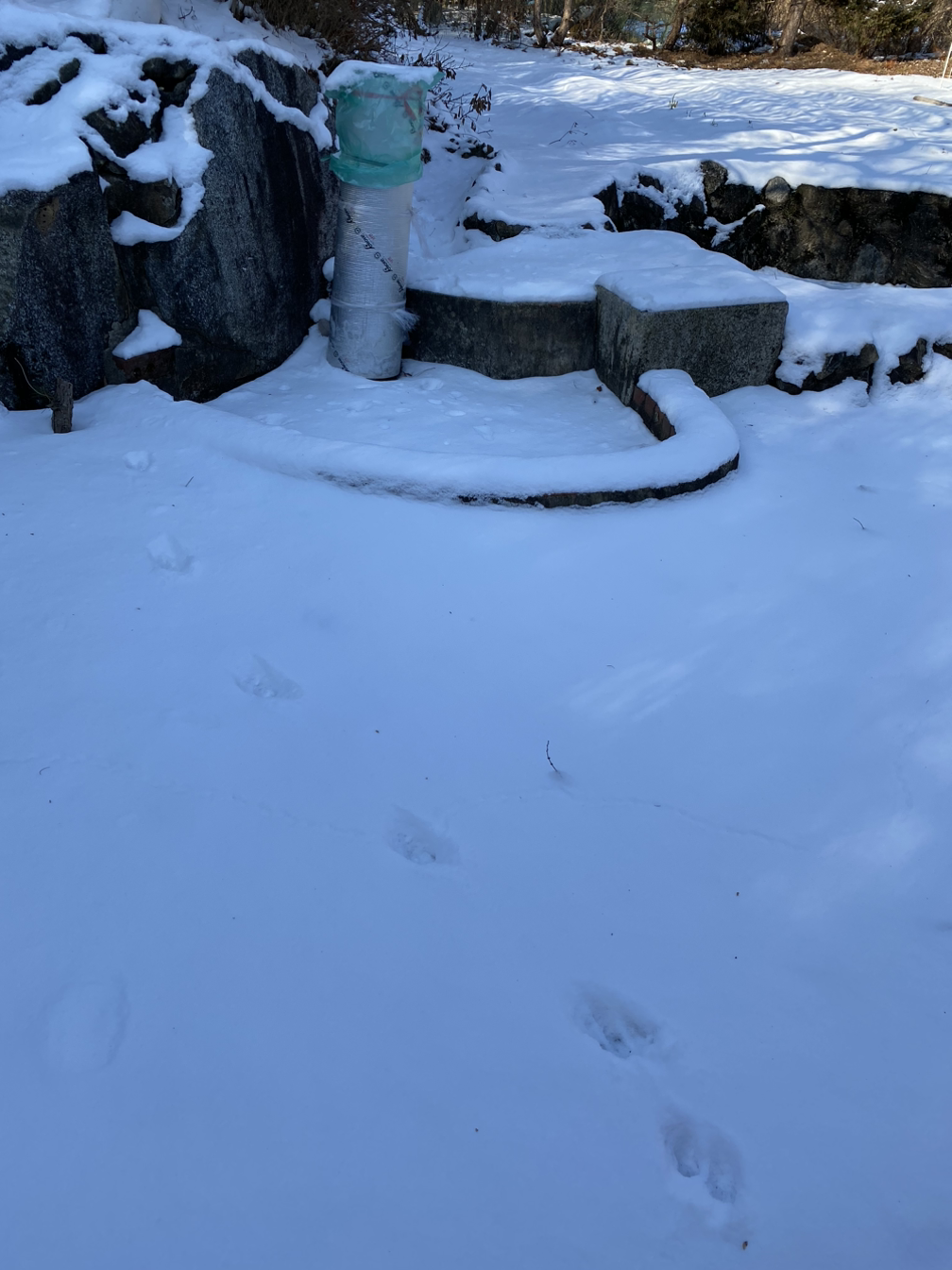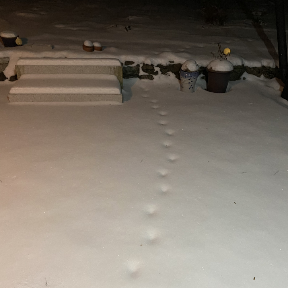 방콕하고 있는 밤 동안 산짐승들이 우리 마당을 지나다니는 상상을, 잔디밭에 떡하니 있는 큰 응가를 보고 떠올려 보긴 했는데, 실제로 눈 위로 크게 찍힌 발자국을 보니 좀 우스스 하기도 합니다. 애초 산짐승이 살던 산 중턱에 사람들이 집을 짓고 살기 시작한 것이니, 새하얀 눈밭과 새까만 밤은 이들의 차지가 되어야 마땅합니다.