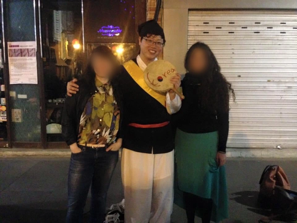 그리고 그녀는 이내 그 동작에 만족스러워하고는, 그제서야 상모의 턱끈을 풀고, 머리 위의 두건을 풀었다. 자신에게 이 춤을 알려 주어 고맙다는 말을 건네며, 이 모자의 이름을 영어 알파벳으로 알려 줄 수 있냐고 물었다.