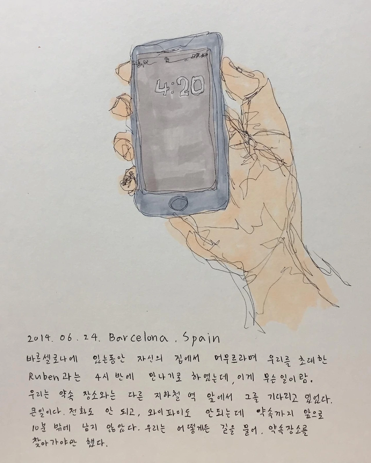 와 있는 게 아닌가. 분명 Ildefons cerda역에 있어야 하는 우리는, Santa equallera역에 서 있었다. 큰 일이다. 전화도 안 되고, 와이파이도 안되는데, 약속 시간까지는 앞으로 10분밖에 남지 않았다. 우리는 어떻게든 길을 물어, 약속 장소를 찾아가야만 했다.