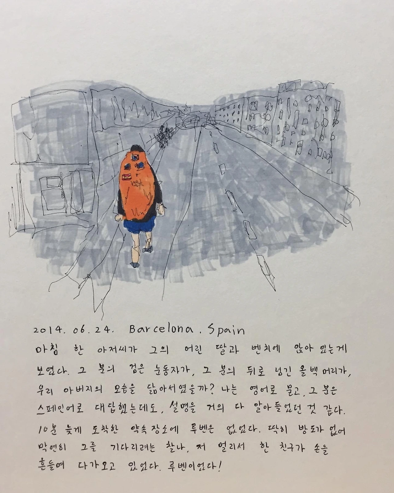 마침 한 아저씨가 그의 어린 딸과 밴치에 앉아 있는 게 보였다. 그분의 검은 눈동자가, 그분의 뒤로 넘긴 올백머리가, 우리 아버지의 모습을 닮아서였을까? 나는 영어로 묻고, 그분은 스페인어로 대답했는데도, 설명을 거의 다 알아들었던 것 같다. 앞뒤로 맨 가방과 배낭을 군장처럼 여기고, 약속 장소까지 전력 질주를 시작하였다.