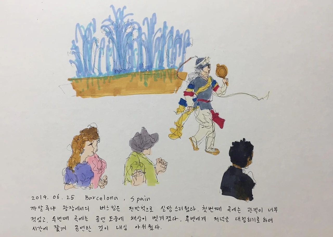카탈루냐 광장에서의 버스킹에 대하여 이야기할 것 같으면, 첫 번째 공연은 관객이 너무 적어, 촬영한 영상이 전혀 만족스럽지 못하였고, 두 번째 공연의 경우에는 공연 도중에 채상이 벗겨지는 탓에 공연 자체가 여간 아쉽고 서운한 게 아니었다. 오늘 저녁에 루벤에게 저녁식사를 대접하기로 하여, 시간에 쫓겨 공연한 것이 내심 아쉬웠다. 나의 공연을 촬영해 준 명헌에게 미안하기도 하였고 말이다.