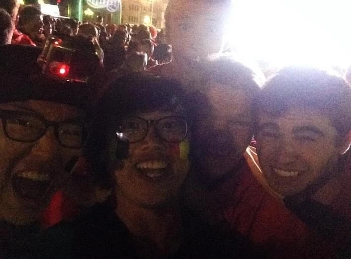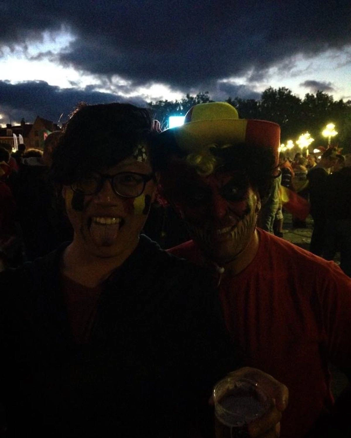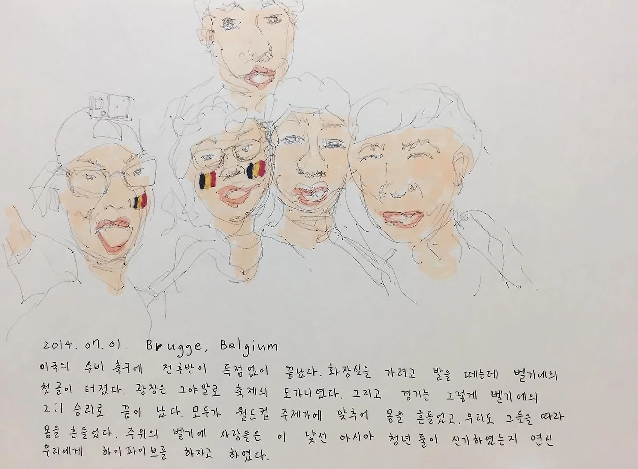 미국의 수비 축구에 경기는 전후반이 득점 없이 끝났다. 화장실을 가려고 발을 떼는데 벨기에의 첫 골이 터졌다. 광장은 그야말로 축제의 도가니였다. 그리고 경기는 그렇게 벨기에의 2:1 승리로 끝이 났다. 모두가 월드컵 주제가에 맞추어 몸을 흔들었고, 우리도 그들을 따라 몸을 흔들었다. 주위의 벨기에 사람들은 이 낯선 아시아 청년 둘이 신기하였는지 연신 우리에게 하이파이브를 하자고 하였다.