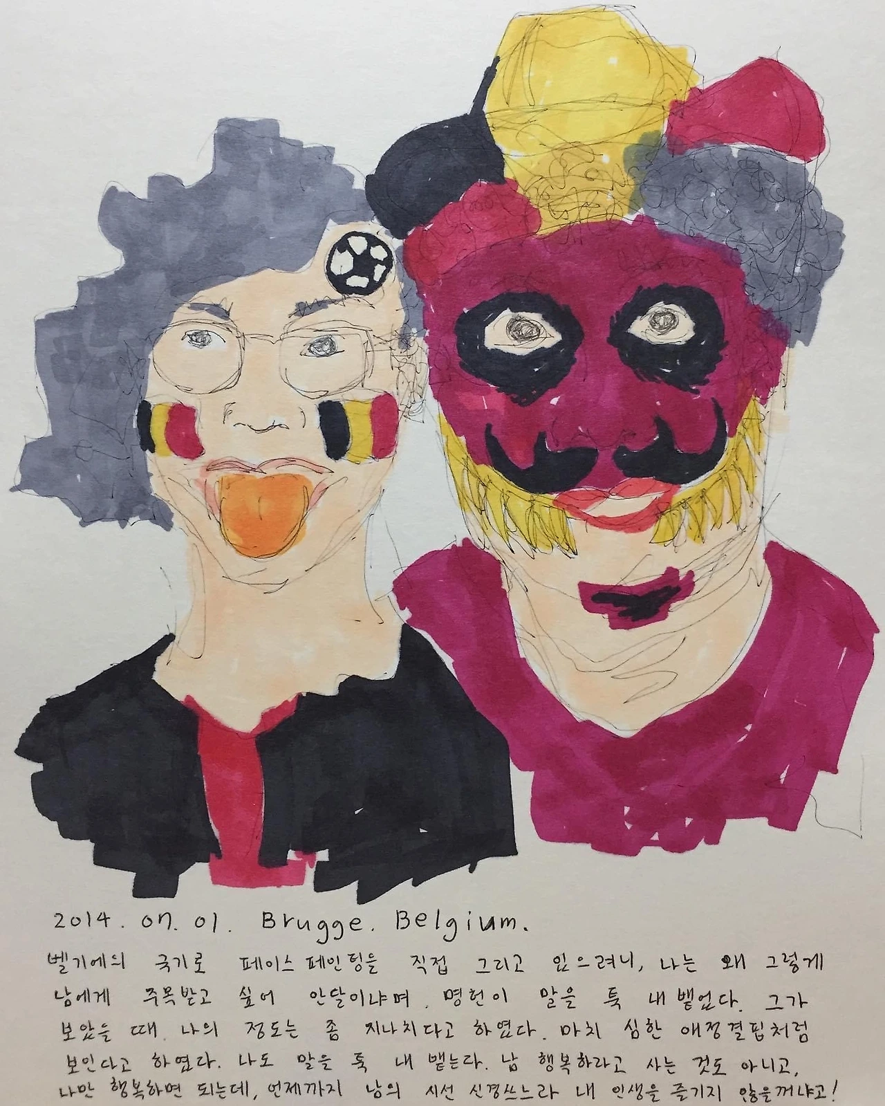 벨기에의 국기로 페이스 페인팅을 직접 그리고 있으려니, 형은 왜 그렇게 남에게 주목받고 싶어 안달이냐며, 명헌이 말을 툭 내뱉었다. 그가 보았을 때, 나의 정도는 좀 지나치다고 하였다. 마치 심한 애정결핍처럼 보인다고 하였다. 나도 그 말에 화가 나서 말을 툭 내뱉는다. 남 행복하라고 사는 것도 아니고, 나만 행복하면 되는데, 언제까지 남의 시선 신경 쓰느라 내 인생을 즐기지 않을 거냐고!