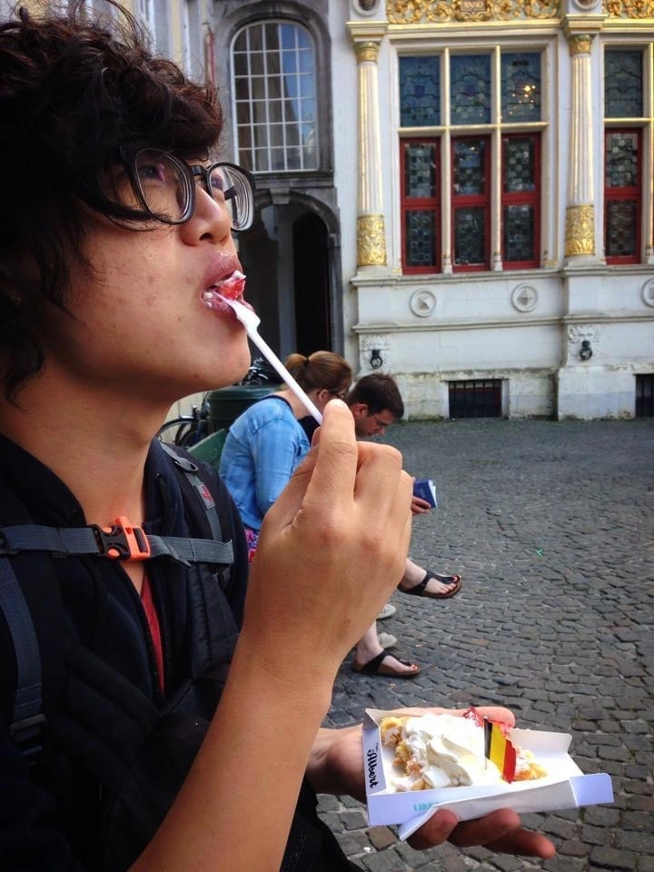 그래도 벨기에에 왔으니, 벨기에의 명물인 벨기에 와플은 먹어줘야 하지 않겠나 하여, 브뤼헤 시청광장에서 와플을 사 먹었다. 요 며칠 돈을 아낀다고 계속 편의점의 바게트와 식빵만으로 끼니를 해결하였는데, 마침 시장의 어느 식당 테라스에 Today special 메뉴인 소고기 스테이크 세트가 15유로(만 오천 원 정도)밖에 안 한다는 안내 문구가 적혀 있었다. 내친김에, 스테이크를 몸보신을 해야겠다고 마음먹었다. 중소 도시의 시장이라 그런지, 식당 인심도 후하다. “애피타이저로 버섯 수프와 마늘 바게트가 있는데 갖다 줄까요?”하고 묻길래, “네, 둘 다 주세요. 감사합니다.”라고 대답했다. 디저트로 커피와 아이스크림이 있다길래, 이번에도 냅다 “예스, 플리즈.”하고 대답을 하였다. 계산할 때까지는 전혀 몰랐다. 오늘의 스페셜 메뉴는 소고기 스테이크와 감자튀김뿐이었고, 나머지 버섯 수프와 마늘 바게트, 커피와 아이스크림은 따로 금액이 청구되는 사이드 디쉬였다는 사실을 말이다. 하하하하하. 스테이크 세트가 분명 1인당 15유로인데, 사이드 디쉬를 다 포함시키니 1인당 30유로의 밥을 먹은 셈이다. 어제와 그제는 3유로짜리 바게트로 아침, 점심, 저녁 세끼를 다 해결했는데, 오늘은 생각지도 않은 덤탱이를 맞아 버렸다. 여행 경비를 절약하기 위해, 아마 다음 일주일동안은 바게트만 먹으며 살아야 할 것 같다. 하하하하.