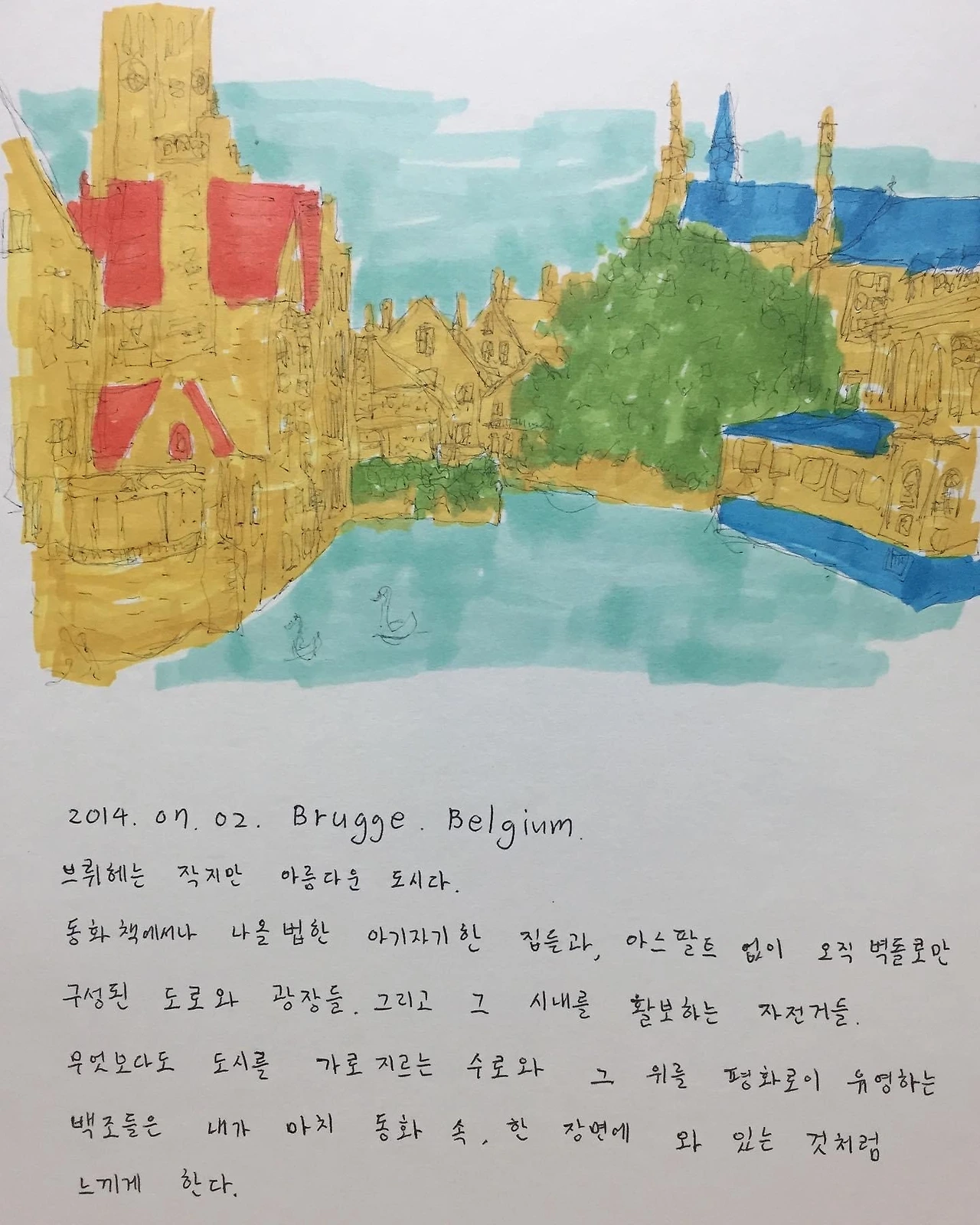 브뤼헤는 작지만 아름다운 도시다. 동화책에서나 나올 법한, 아기자기한 집들과, 아스팔트 없이 오직 벽돌로만 구성된 도로와 광장들! 그리고 그 시내를 활보하는 자전거들! 무엇보다도 도시를 가로지르는 수로와 그 위를 평화로이 유영하는 백조들은 내가 마치 동화 속 한 장면에 와 있는 것처럼 느끼게 한다.