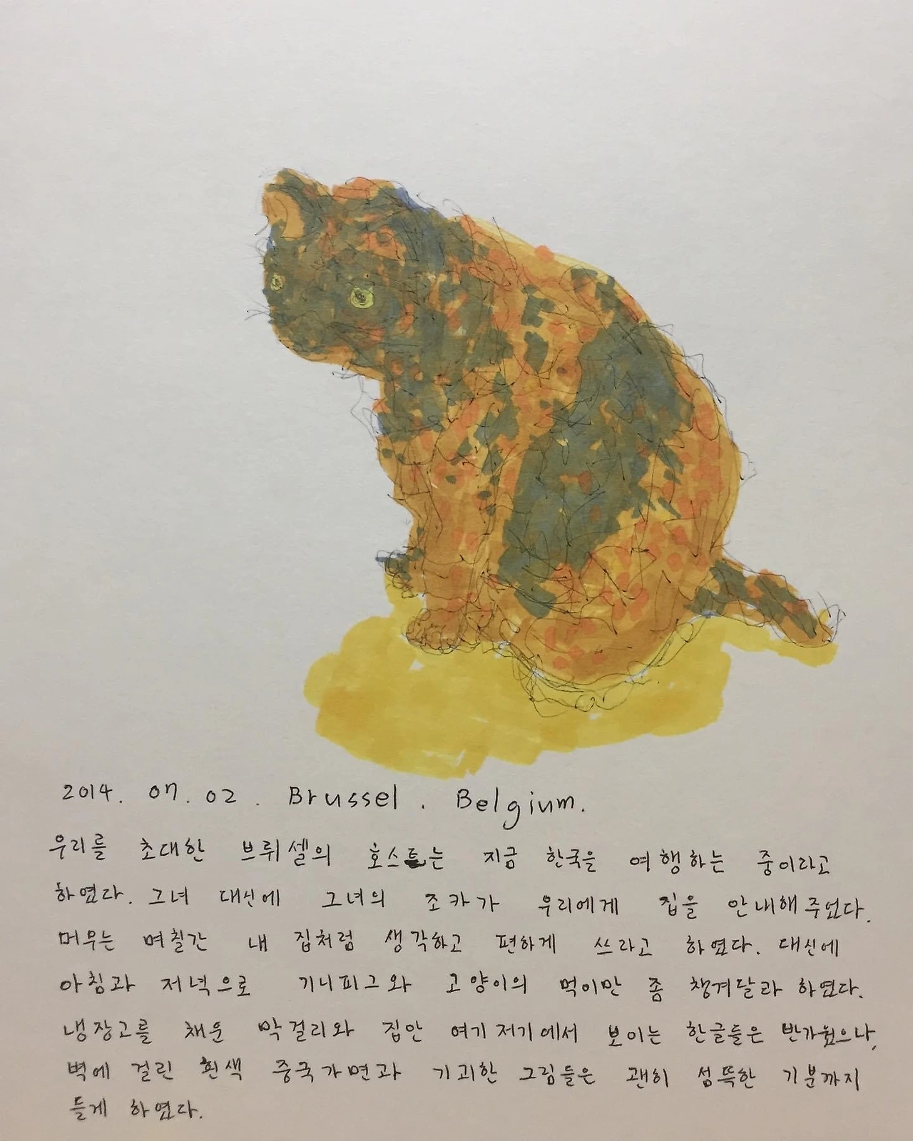 브뤼헤에서 기차를 타고, 그다음 목적지인 벨기에의 수도, 브뤼셀로 넘어왔다. 우리를 초대한 브뤼셀의 호스트, 로렌스는 지금 한국을 여행하는 중이라고 하였다. 그녀 대신에 그녀의 조카가 우리에게 집을 안내해주었다. 머무는 며칠간 내 집처럼 생각하고 편하게 쓰라고 하였다. 대신에 아침과 저녁으로 기니피그와 고양이의 먹이만 좀 챙겨달라 하였다. 냉장고를 채운 막걸리와 집안 여기저기에서 보이는 한글들은 반가웠으나, 벽에 걸린 흰색 중국 가면들과 기괴한 그림들은 괜히 섬뜩한 기분까지 들게 하였다.