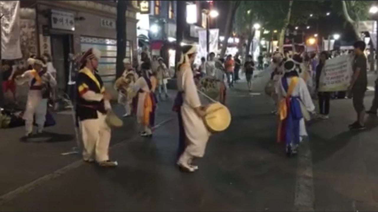 부산 온새미학교의 고등학생 친구들을 인사동에서 만난 것은 2016년의 어느 가을날이었다. 나는 그날도 어김없이 저녁 7시쯤에 안국역에 도착하여, 버스킹 준비를 하고 있는 중이었다. 그런데 인사동 안쪽 저만치에서 갑자기 풍물패의 공연 소리가 들리었다. 한 15분가량 큰 소리로 꽹과리와 북, 징, 장구 소리가 들리다가 그치기에 어느 한 풍물패의 짧은 길놀이 정도로 여기고는 나의 버스킹 공연을 마저 이어 나갔다. 한 10분쯤 지났을까? 아까보다 좀 더 가까운 곳에서 풍물패의 판굿 소리가 들리었다. 아무래도 남인사마당에서부터 북인사마당에 이르는 그 길을 주욱 따라 올라오며 게릴라 공연을 하는 모양이었다.