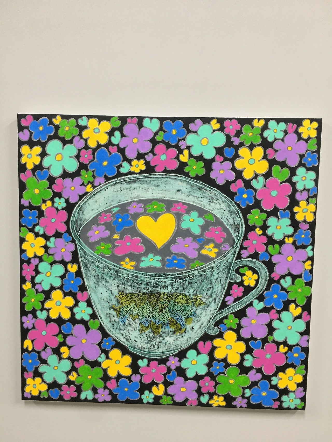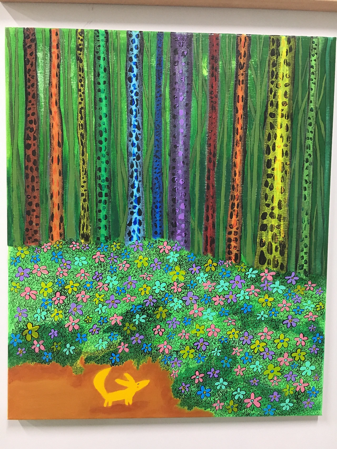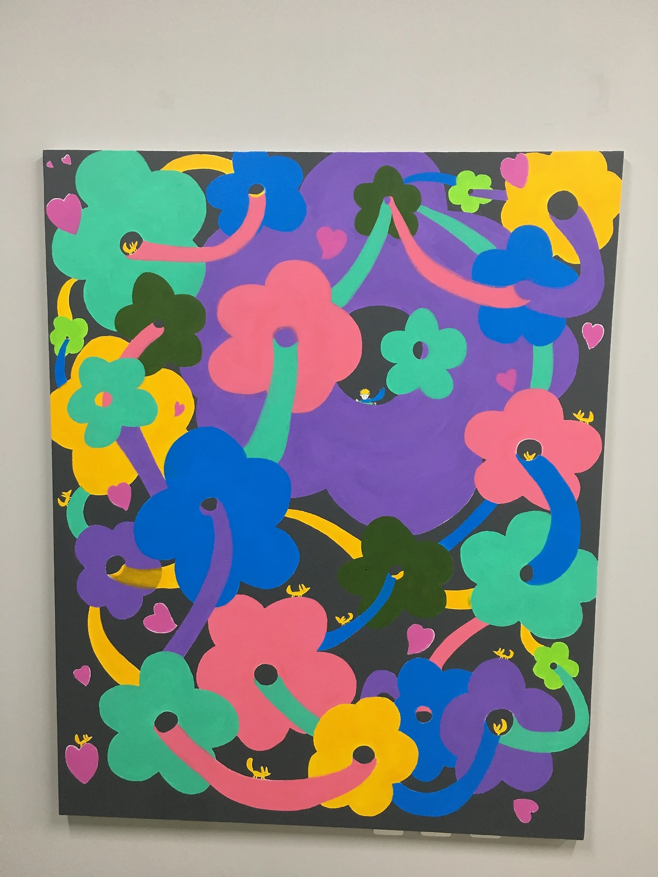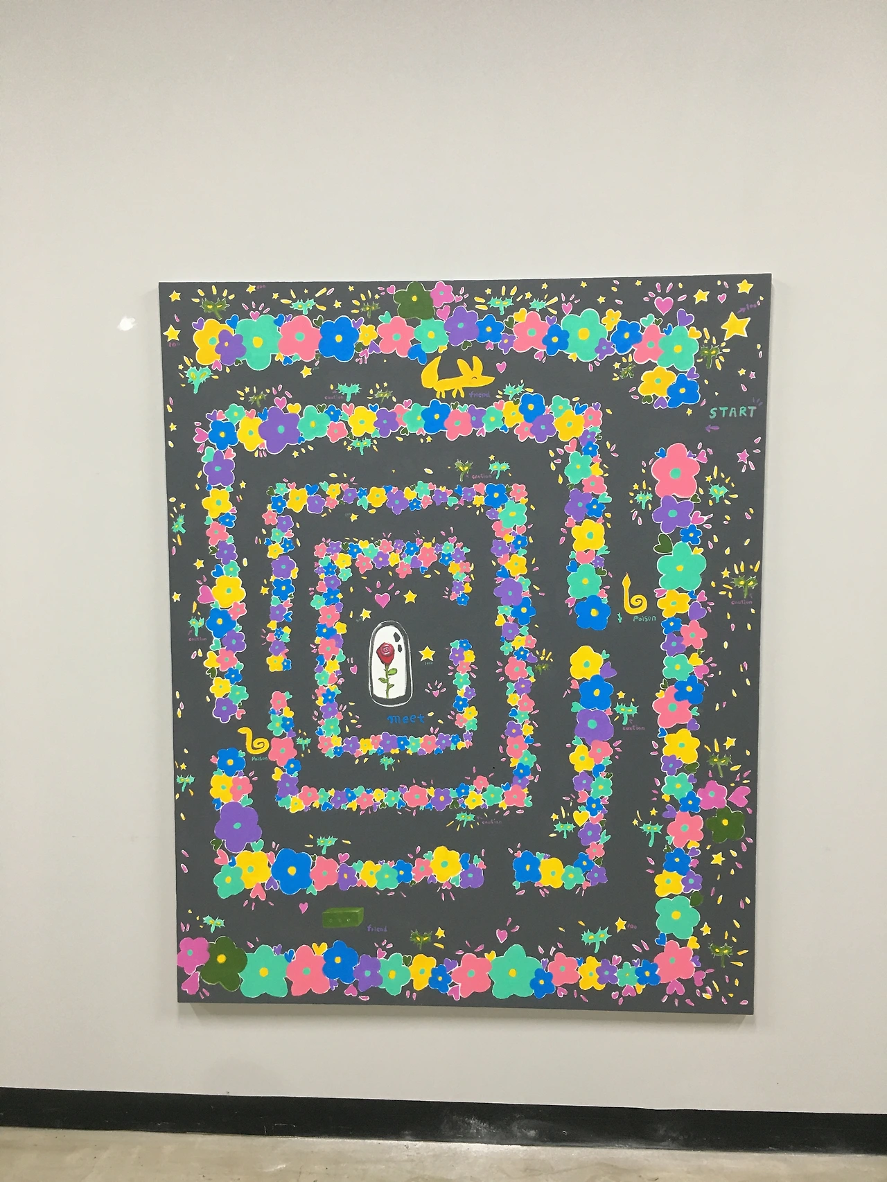 이쯤 되니, 갑자기 작가님께 궁금한 점이 생겨났다. 작가님께서는 그간 작업해오시던 장지와 안료, 염색과 탁본의 작업을 내려놓으시고, 이번에는 왜 아크릴 물감과 캔버스라는 새로운 도구로 어린 왕자를 그리기 시작하셨을까? 이유는 생각보다 간단하다고 하셨다. 바로, 작업에 사용할, <물이 없어서>였다고! 작가님의 최근 작품들은 모두 제주도에서의 한 달 살기와 그리고 지금 이곳 파주 아트팩토리 작업실에서의 결과물이라고 하셨다. 어린 왕자는 그리고 싶은데, 두 공간 모두, 물을 사용할 수 있는 환경이 아니었다고 하셨다. 작가님의 그림은 염색이 베이스가 되는 작업이기에, 물을 많이 사용하고, 또 물을 자주 버려야 하는데, 이곳에서도, 그리고 제주도에서도 물을 한번 사용하려면 옆 건물의 지하 일층 여자화장실까지 양동이를 들고 여러 번 왔다 갔다를 하셨어야 했다고 한다. 그렇게 몇 번을 물이 담긴 양동이와 사투를 벌이시다가 결국에는 최대한 물을 적게 사용하는 아크릴 물감과 캔버스를 선택하셨다고 한다. 기존의 염색 작업과는 또 다른 그림 그리는 재미가 있어 매우 즐거운 시간들이셨다고 한다. 원하는 컬러를 좀 더 자유롭게 사용할 수 있어 좋았고, 그래서 내 안의 어린 왕자를 찾아가는 그 내면의 시간들을 숨바꼭질과 미로 찾기라는 아이들의 놀이로 표현해보셨다고 하였다.