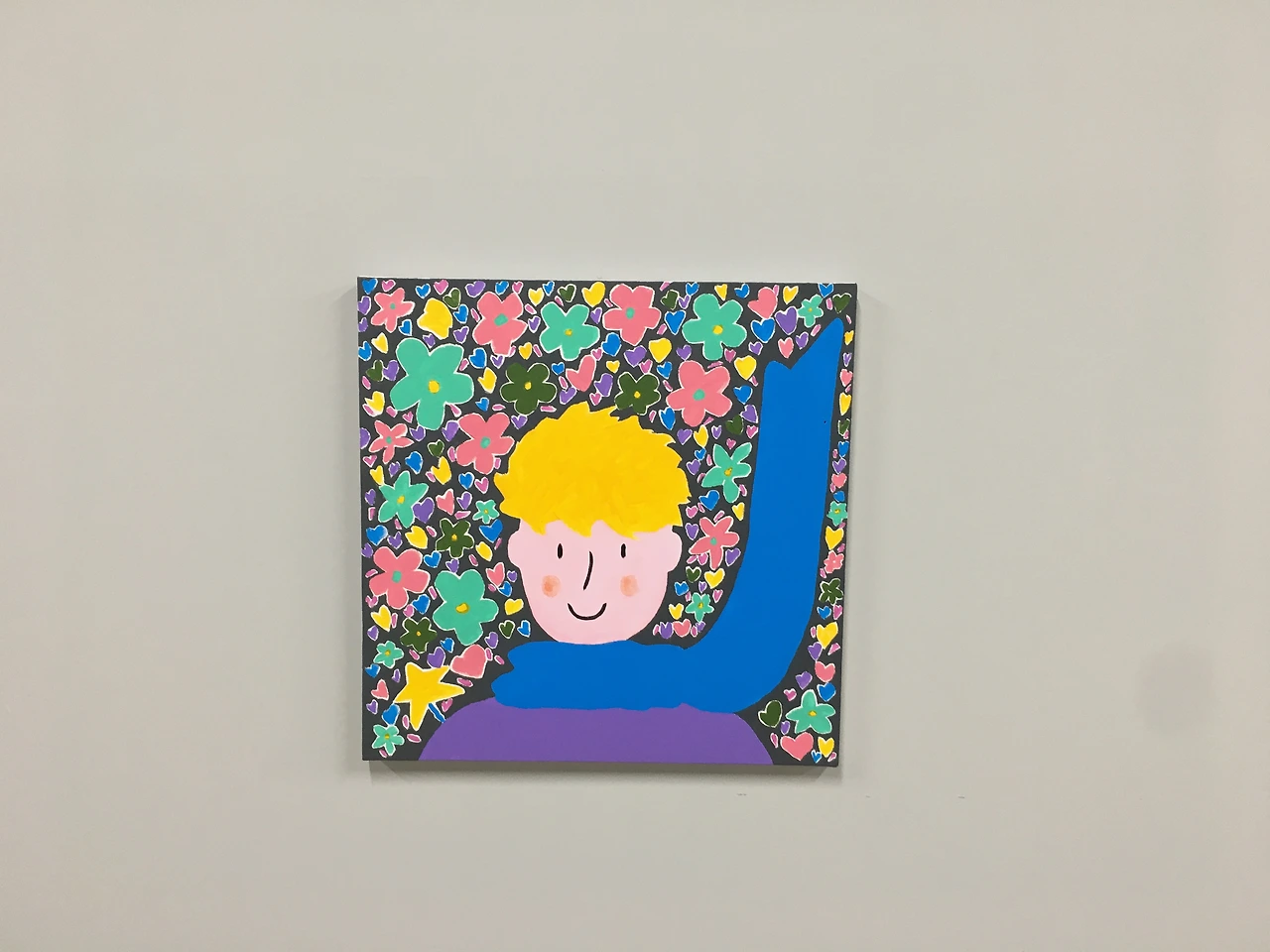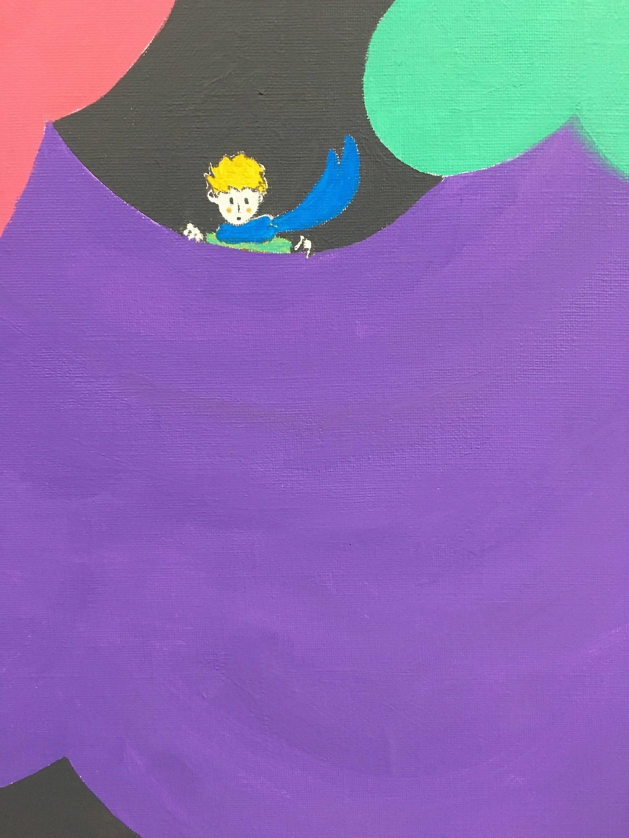 보라색 옷에 대한 나의 질문에, 작가님께서는 파란색 머플러에 대한 이야기로 답해주셨다. 작가님께 파란색은 매우 특별한 컬러라고 하셨다. (작가님의 다른 장지 작품들을 보면, 유독 하늘을 닮은 파란색 그림들이 많다.) 어린 왕자의 머플러에, 작가님께서 제일 좋아하는 파란색을 담고 보니, 어린 왕자의 노란 머리와 어울릴 법한 의상 색감이 보라색 말고는 그리 많지 않으셨다고 하였다.