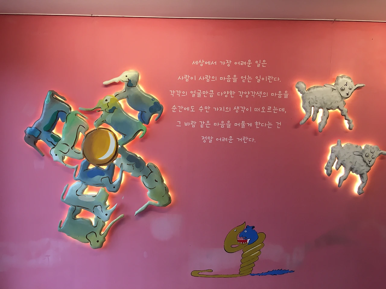 물론, 그곳에는 여러 나라의 언어로 쓰여진 수십 권의 어린 왕자 책들이 있었고, 소설 속 명대사를 적은 벽화 그림들도 있었다. 어린 왕자의 삽화 일러스트를 전시한 공간도 있었으며, 생텍쥐페리의 생애를 기록한 공간도 있었다. 그러나 이 공간들에 대하여 왠지 모를 아쉬움과 섭섭함을 숨길 수가 없었다. 본래, 기대가 크면, 실망도 크다고 했던가? 이곳 전시공간들은 나에게는 너무나도 딱딱한 교과서만 같았다. 나는 시간 가는 줄 모르게 술술 읽히는 소설책을 기대하고 왔는데, 이곳의 모든 전시들은 백과사전처럼 딱딱했다.