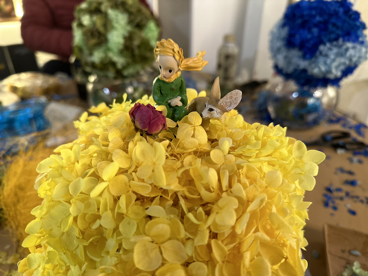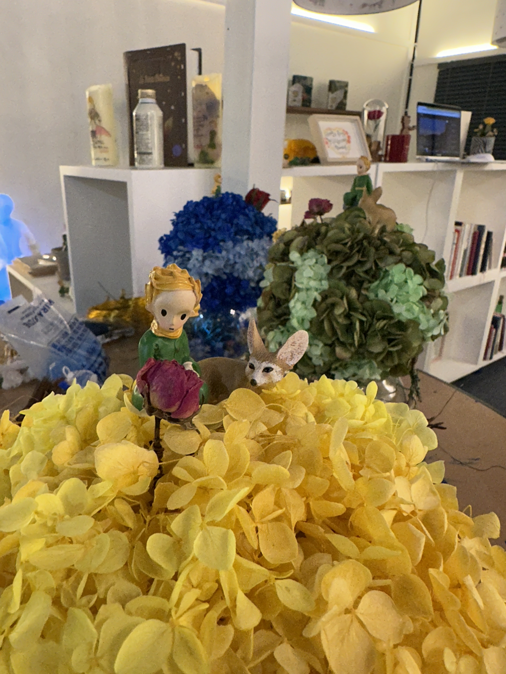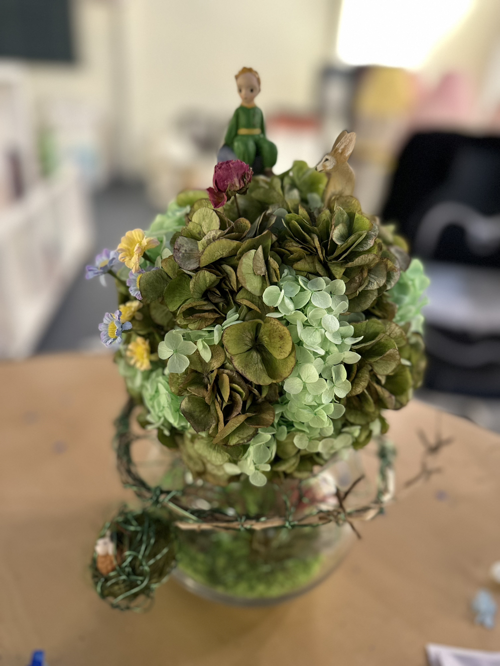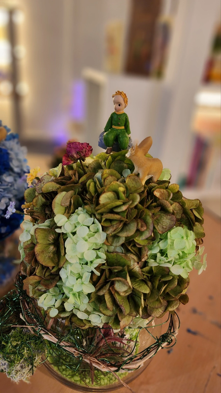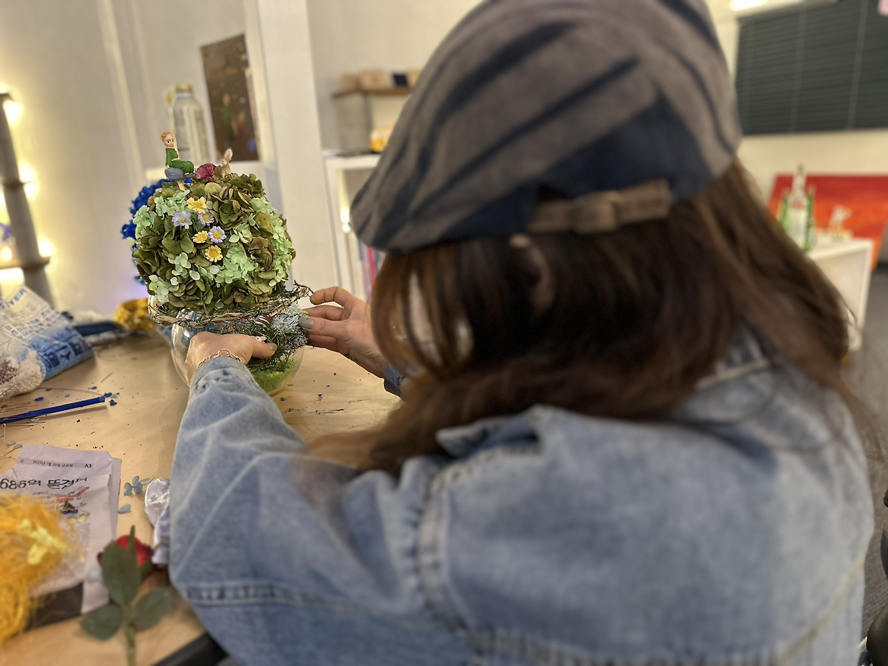블루데이지님께서는 그저 단순하게 드라이 플라워 작품에 어린왕자 피규어만 얹는 작업을 하고 싶지 않으셨다고 한다. 그리하여 이 곳 초록공간에서의 원데이 클래스를 위하여, 어린왕자 책을 읽고, 또 읽고, 또 읽으신 다음에, 나에게 한번 더 정확한 내용을 확인하고 싶으셨다고 한다. 그리하여 소설 속의 여운이 진득하게 남는 명작 꽃꽂이 작품을 함꼐 만들어 보고 싶으셨다고 하였다.
