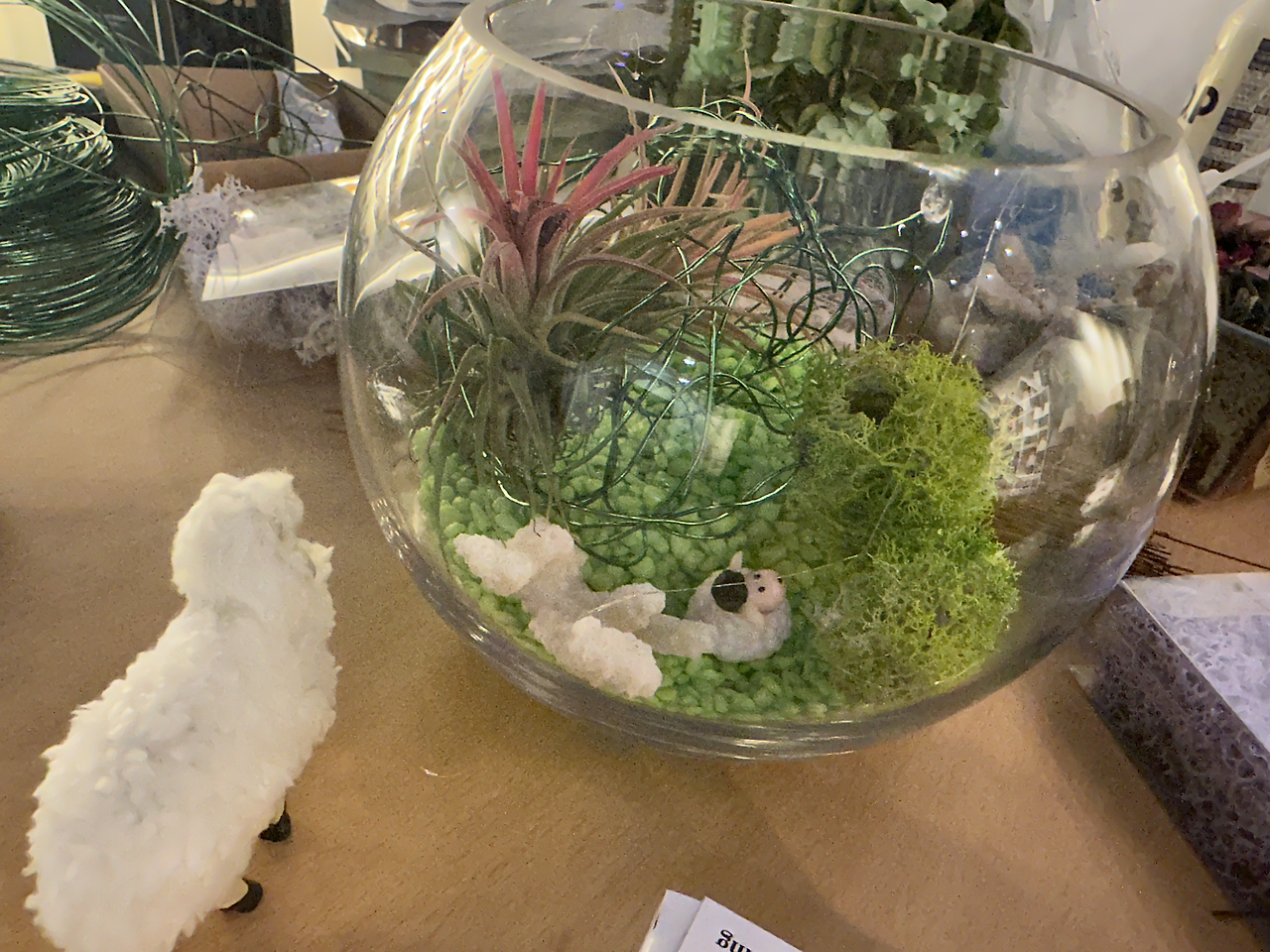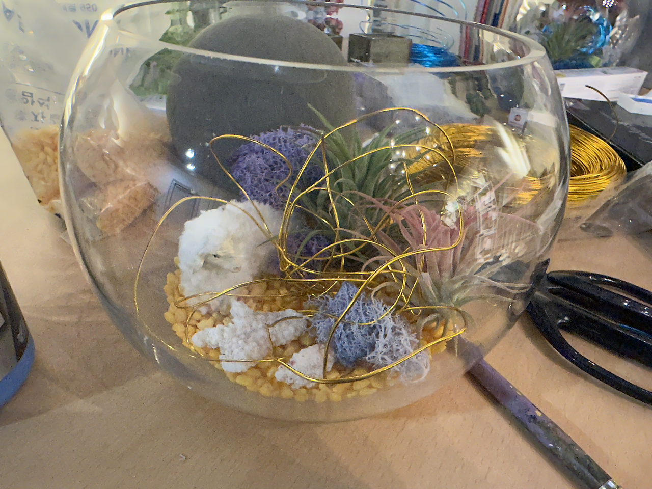 블루데이지님께서는 이 작업에서 가장 중요한 것은 "유리 단지에 양을 넣는 것"이라고 말씀하셨다. 유리 단지에 양 피규어를 넣지 않는다면, 바오밥나무가 B-612 행성에 무시무시한 뿌리를 내려 거침없이 자라게 될 거고, 그렇게 되면 우리가 오늘 작업한 이 꽃꽂이 수업도 모두 물거품으로 돌아갈 지도 모른다고 말씀하셨다.