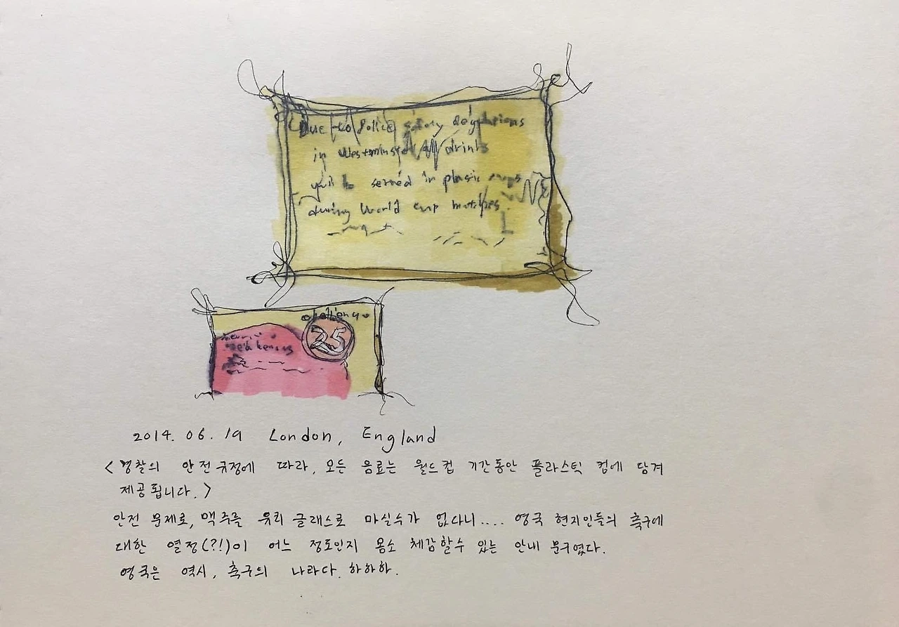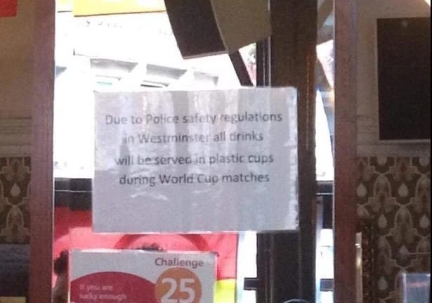 <경찰의 안전 규정에 따라, 모든 음료는 월드컵 기간 동안 플라스틱 컵에 담겨 제공됩니다>