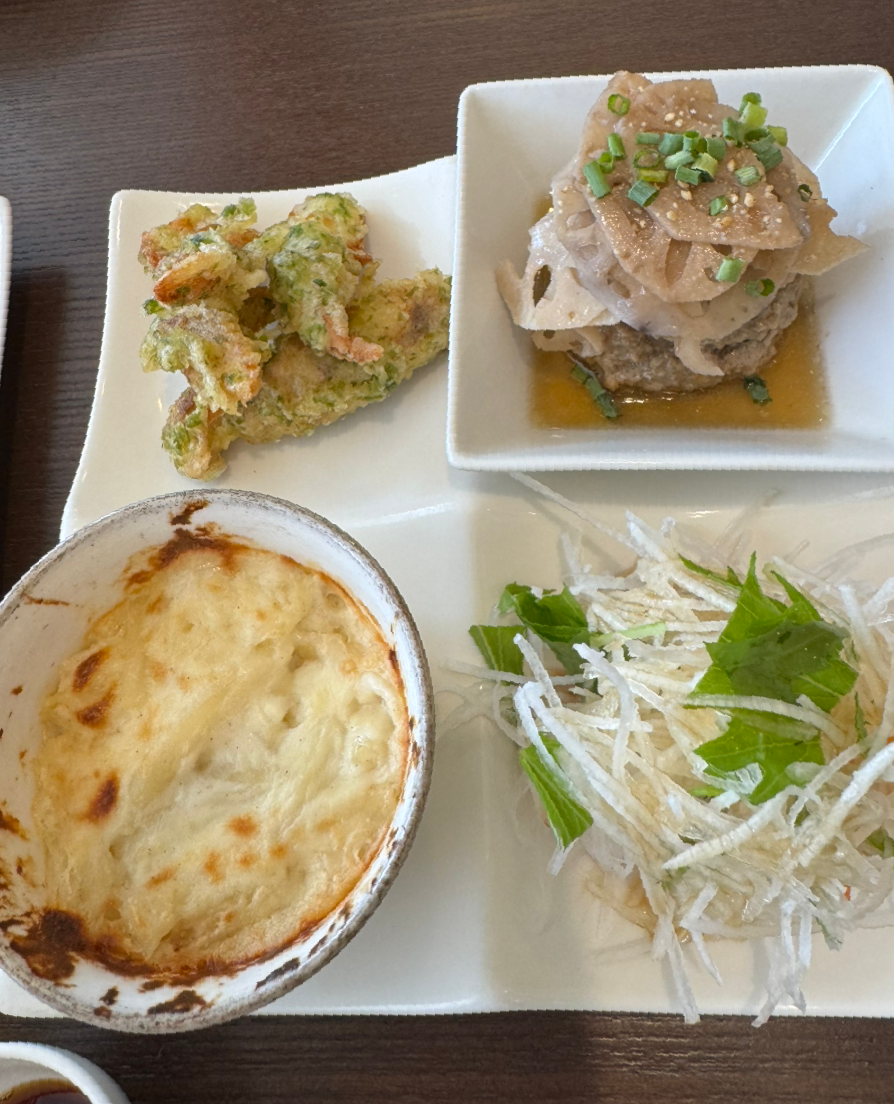 메인은 일본풍 함박스테이크와 오이타명물 토리텐(닭고기튀김), 그라탕과 무채샐러드