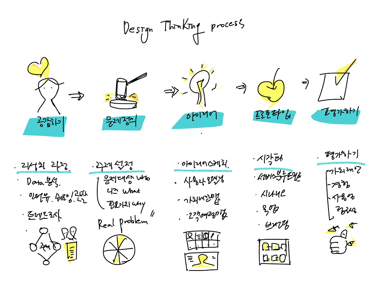 디자인씽킹의 프로세스는 하나의 제품과 서비스를 개발하는데 신속하고 효율적인 방법론이다.