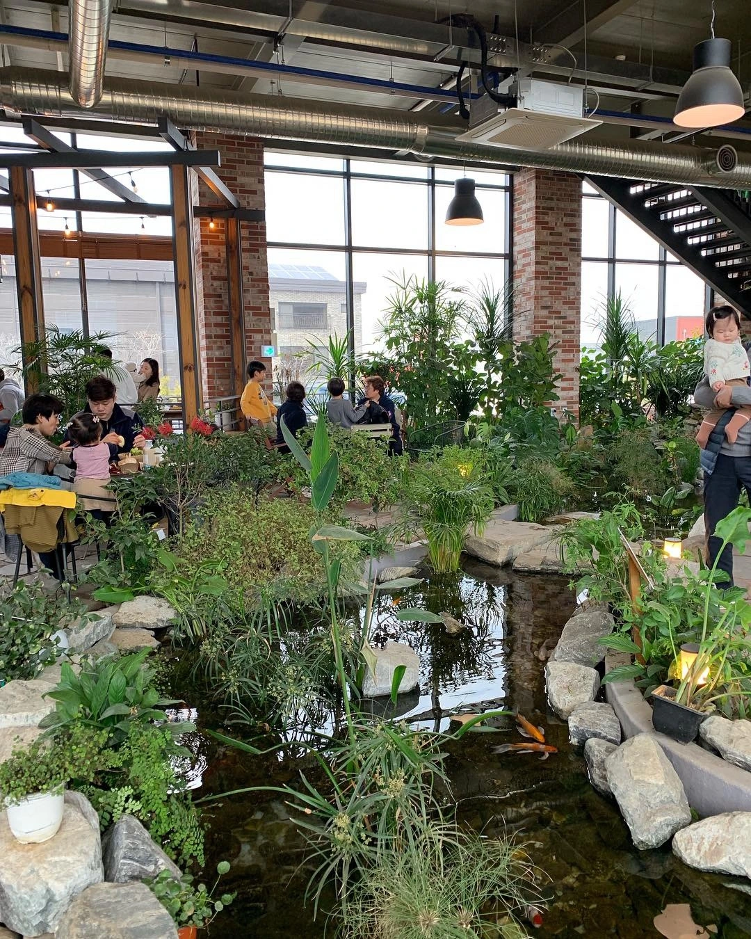 야외 정원에서 느낌을 살리고 실내 연못과 플렌 테이어가 잘 어우러진다.