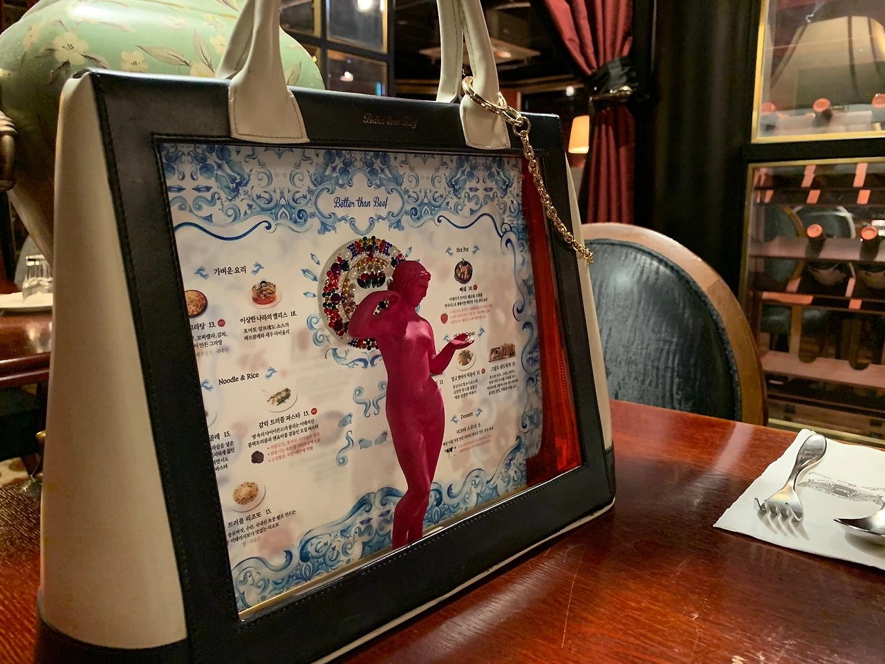 그리고 메뉴 선택, 메뉴판부터가 범상치 않은 핸드백 하나를 건네며 메뉴를 고르라고 한다.